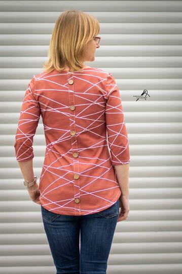 Mit meinen Schnittmustern erhältst du eine ausführlich bebilderte Schritt für Schritt Anleitung, die mit Näherfahrung gut zu meistern ist. Bei diesem Schnitt handelt es sich um ein Basic Shirt mit V- Ausschnitt, dass eng anliegt mit optionaler Fakeknopfleiste mit geraden oder Bischofsärmeln zu nähen ist. Eine Kapuze kann ebenso optional gewählt werden. Die Größen 32 – 52 sind im Schnittmuster inkludiert.