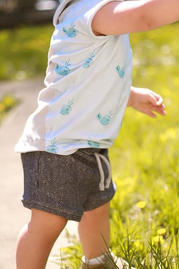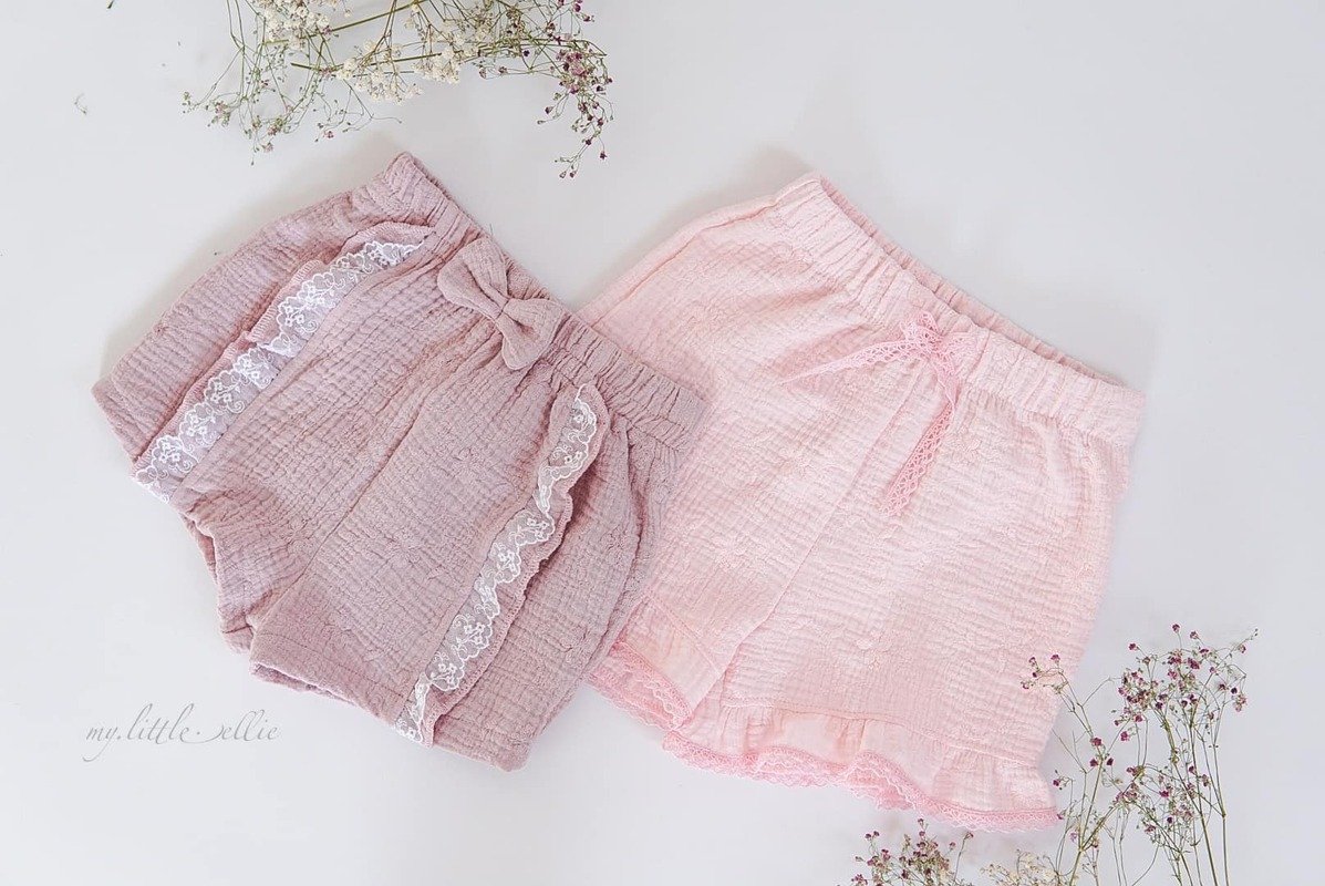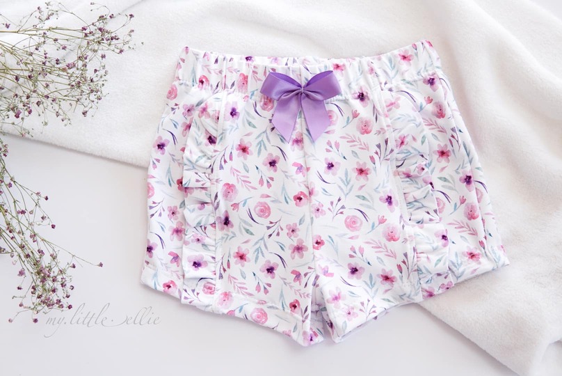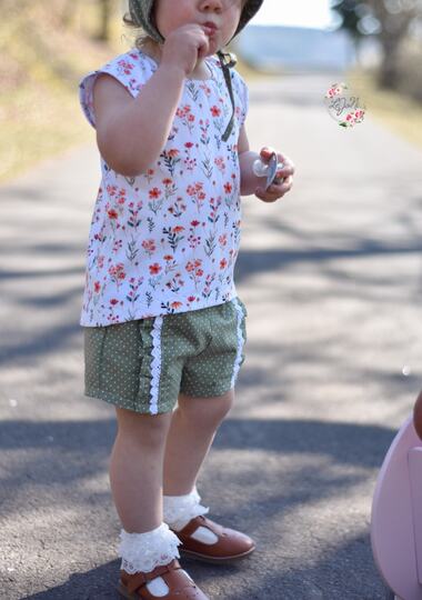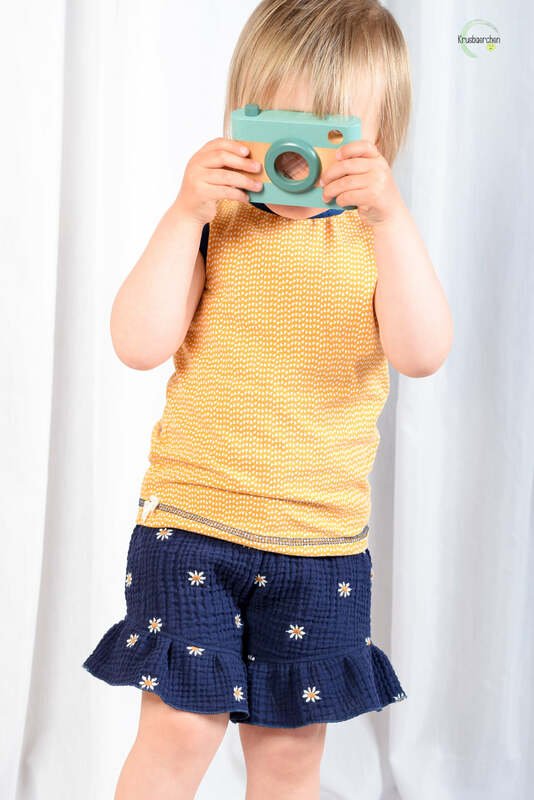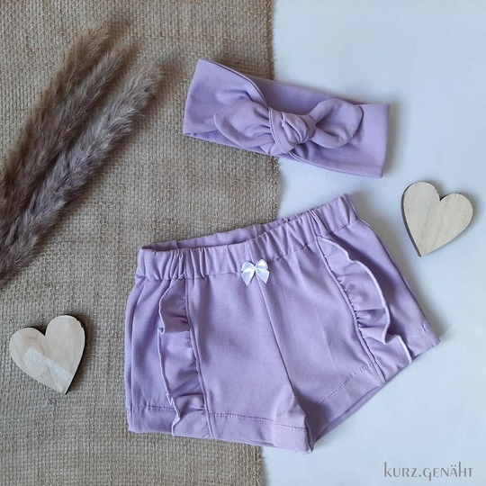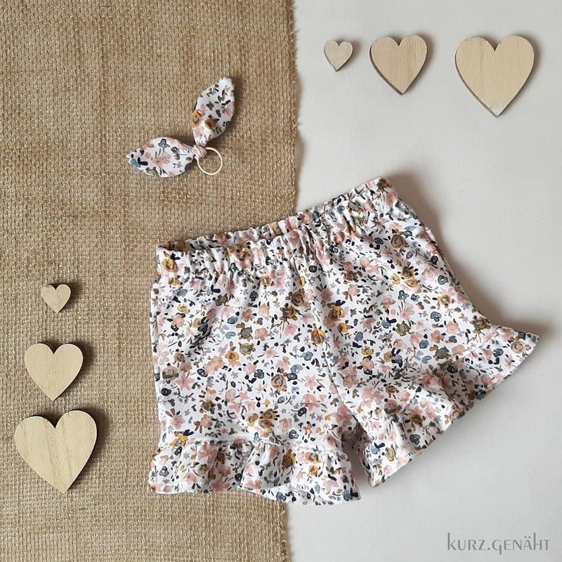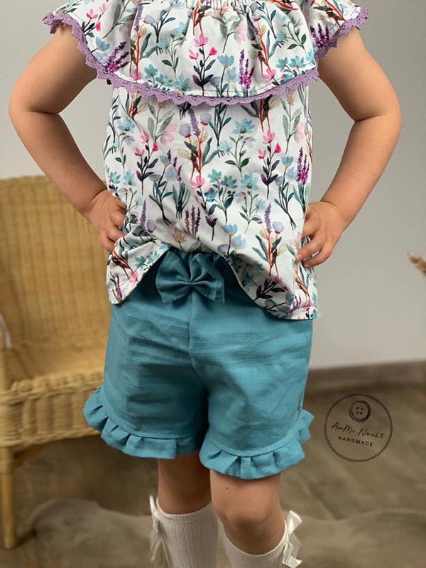 Die Shorts lässt sich in 4 Varianten nähen, ob mit Teilungsrüsche, Beinrüsche, Beinbündchen oder gesäumt. Für jeden Look ist das passende dabei, auch die Jungs kommen nicht zu kurz mit der Basic Variante.