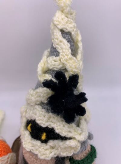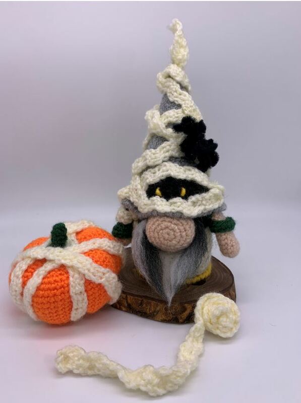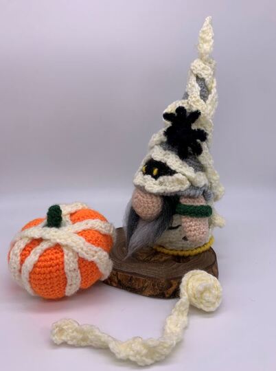 Mit dieser Anleitung kannst du eine gruselige Mumie (Gnom) häkeln, und einen Kürbis, der ebenfalls in Bandagen eingewickelt ist.
