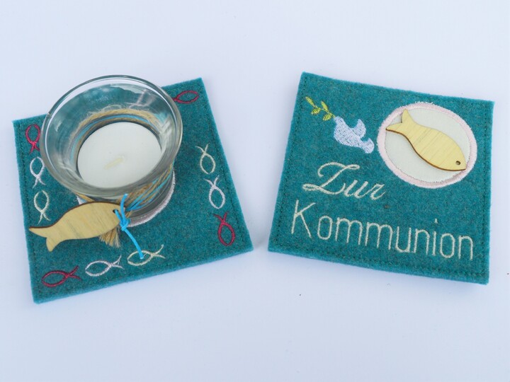 Untersetzer mit christlichen Symbolen, ideal für die Tisckdekoration! In die kleine, runde Applikation passt ein Teelichtchen.