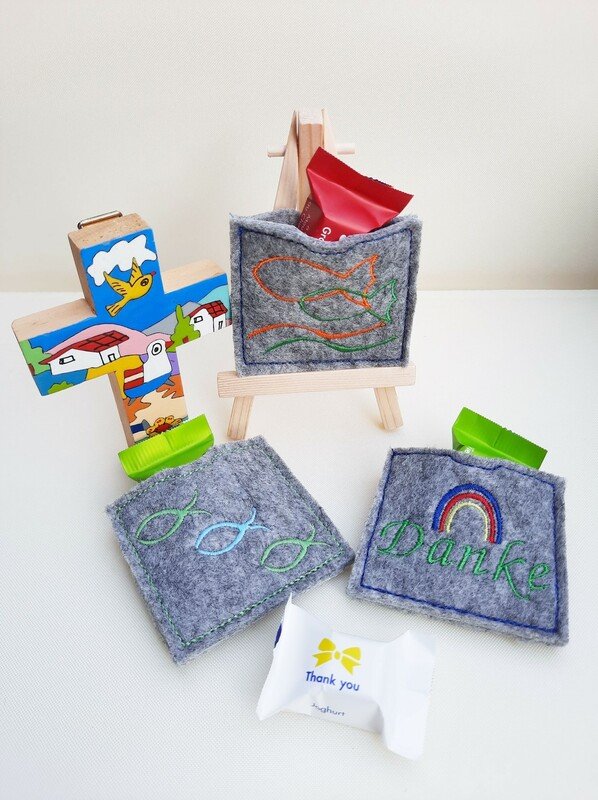 Zusätzlich ist jedes Stickbild im Mehrfachstickbogen gespeichert, wo 4 Schokohüllen in einem Durchgang gestickt werden können.