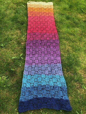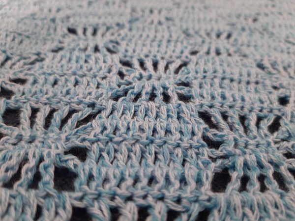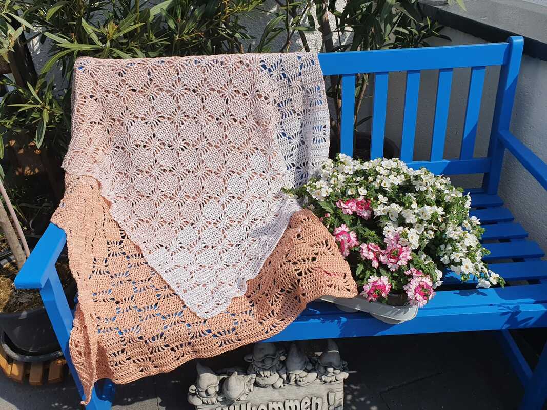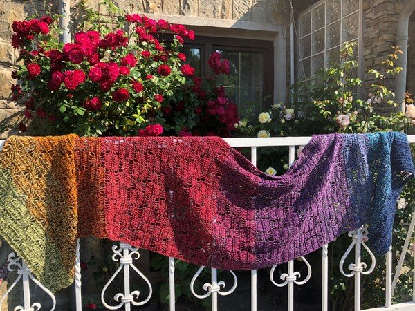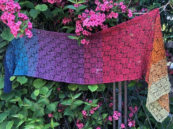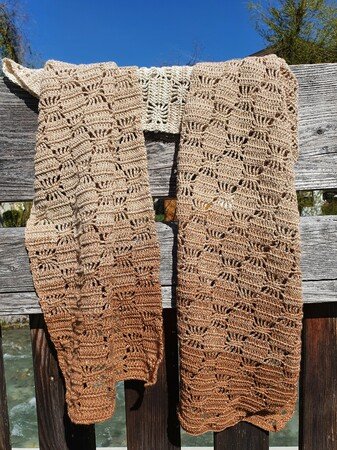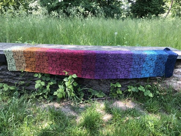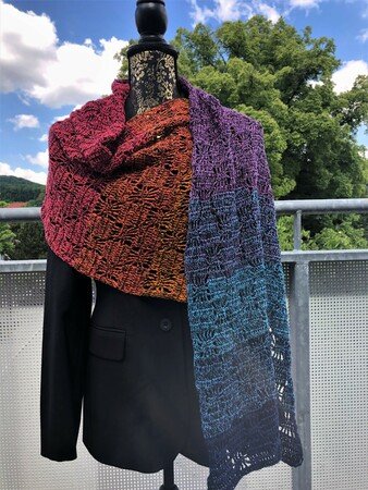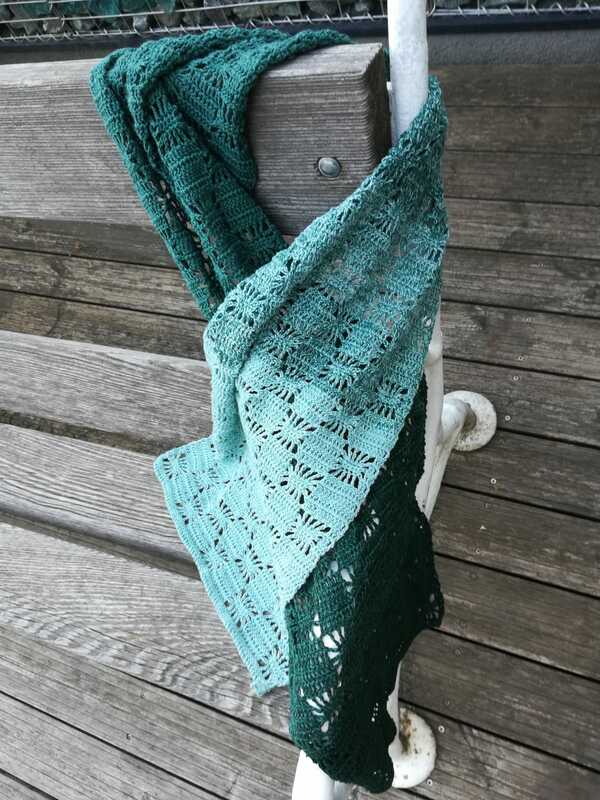 Bei Farbverlaufsgarn empfehle ich je nach Wunschgröße und Häkelstil eine Lauflänge von 900 bis 1000 m 3-fädig. Für eine Stola solltest du entsprechend mehr Lauflänge einplanen.
