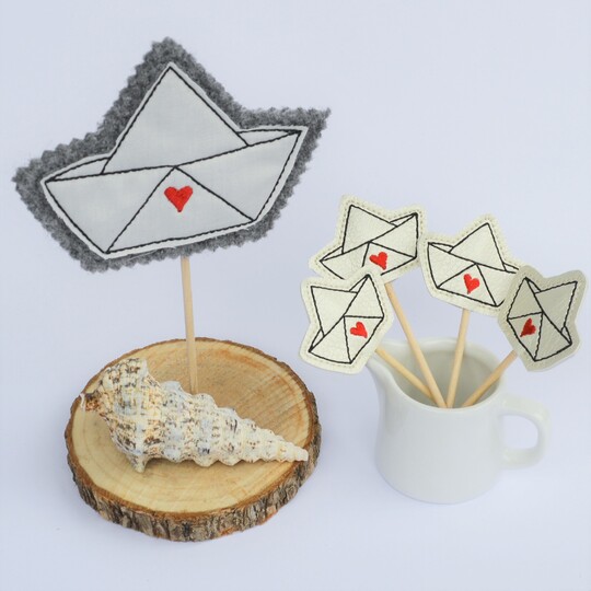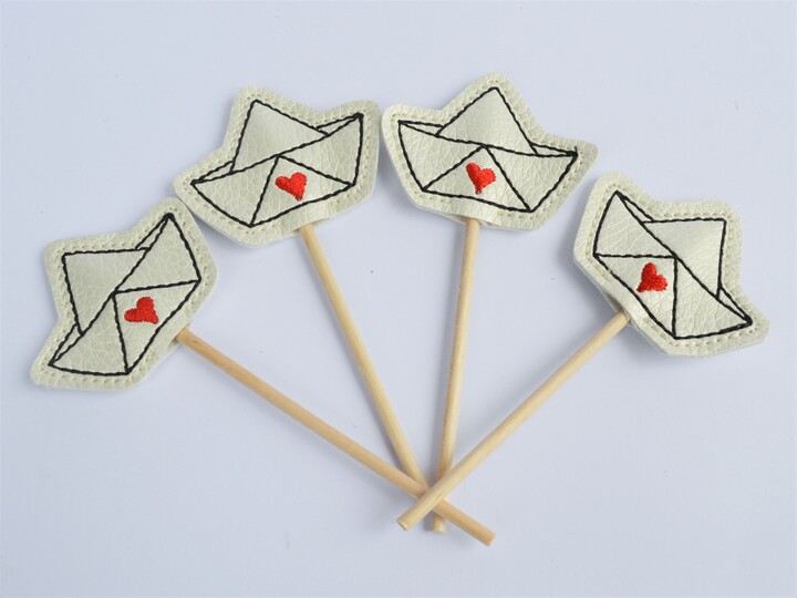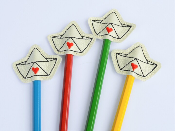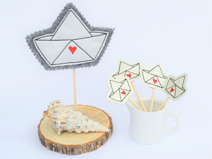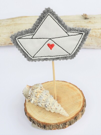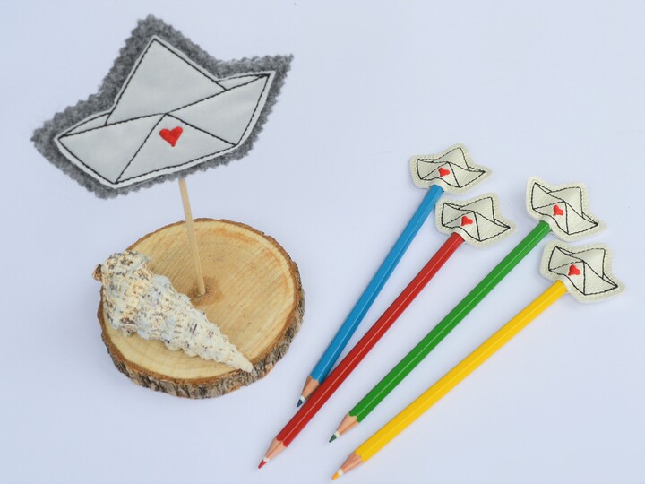 Die kleinen Schiffchen werden zu 4 Stück im 10x10cm Rahen gestickt und passen als Topper für Buntstifte, Bleistifte oder aus als Topper für Muffins und Kuchen!