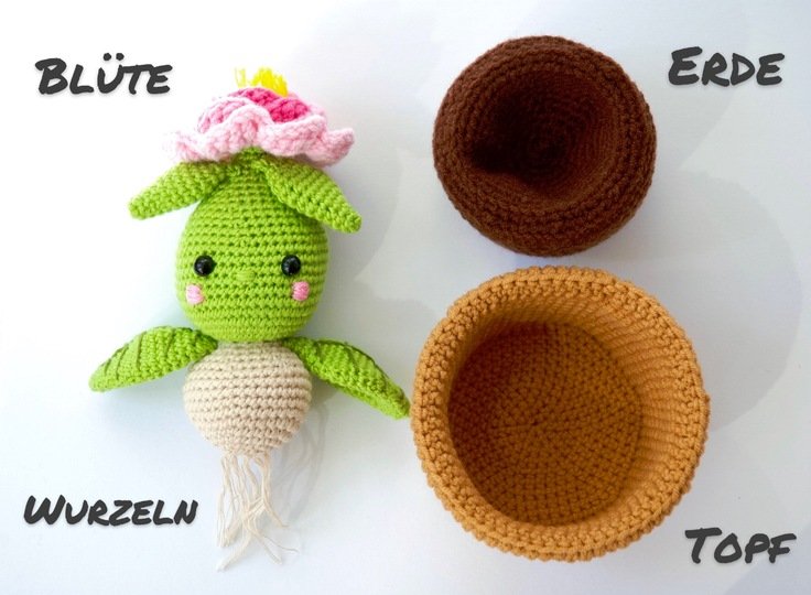 Es ist fast kein Nähen notwendig. Die Blume wird in einem Stück (mit Farbwechseln) gehäkelt, bis auf die Blätter, diese werden am Ende angenäht. Die Erde und der Topf werden separat gehäkelt und dann ineinander gesteckt.