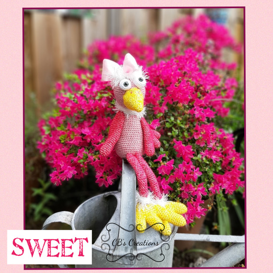 Flauschiges Garn für das Haar mit Häkelnadel 4, Antique pink, Körper, Kopf und Schwanz, verwendet 40 Gramm, Raspberry, Flügel und Beine, verwendet 35 Gramm