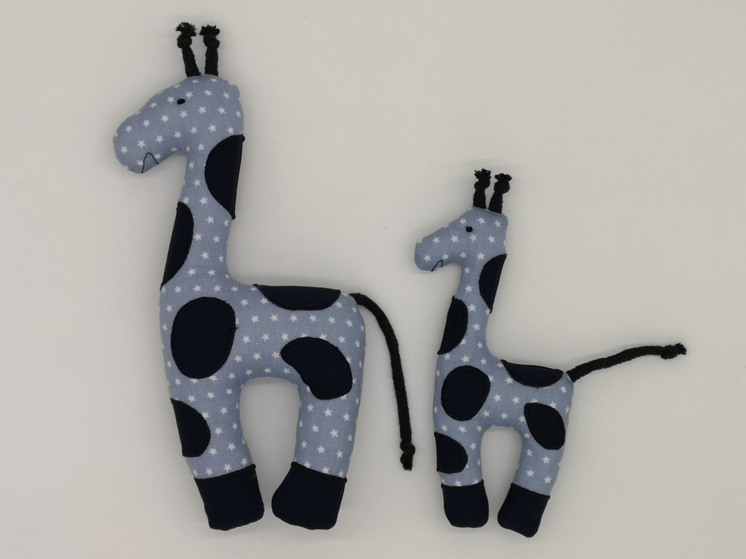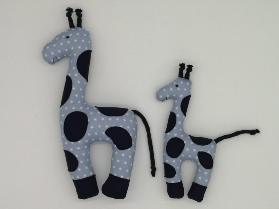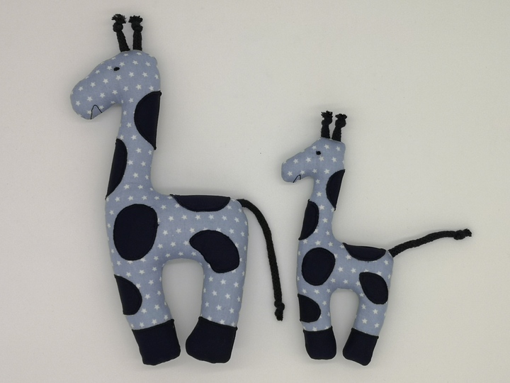 Die große Giraffe ist ca. 25 cm x 14 cm groß. Die Babygiraffe ist ca. 18 cm x 10 cm groß.