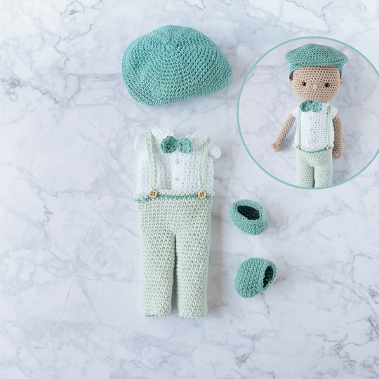 Dieses Set beinhaltet: Schieberkappe, Hemd, Hose mit Hosenträgern, Schuhe.