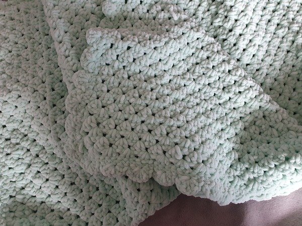 Das Muschelmuster, mit der ich die Decke nach Fertigstellung umhäkelt habe bietet einen zauberhaften Abschluß und passt perfekt zum Muster.