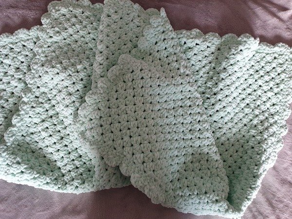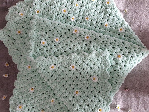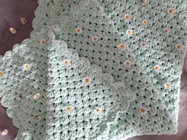 Die Babydecke wird mit Luftmaschen, festen Maschen und normalen Stäbchen gehäkelt.