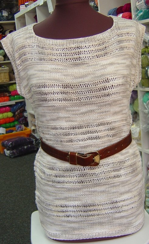 Dieses leicht zu strickende Sommer-Modell Gr. 38/40 ist gefertigt aus 250 g Baumwollmischgarn für Nadelstärke 3,5 - 4,0, 50 g - 125 m. Die Anleitung ist bebildert. Das fertige Shirt hat eine dehnbare Rückenbreite von ca. 44 cm und ist ca. 65 cm lang, sieht aber auch kürzer hübsch aus. Aufgrund des einfachen Musters (aus Umschlägen, rechten und linken Maschen) und Schnitts lässt sich dieses Teil auf jede Größe leicht anpassen.