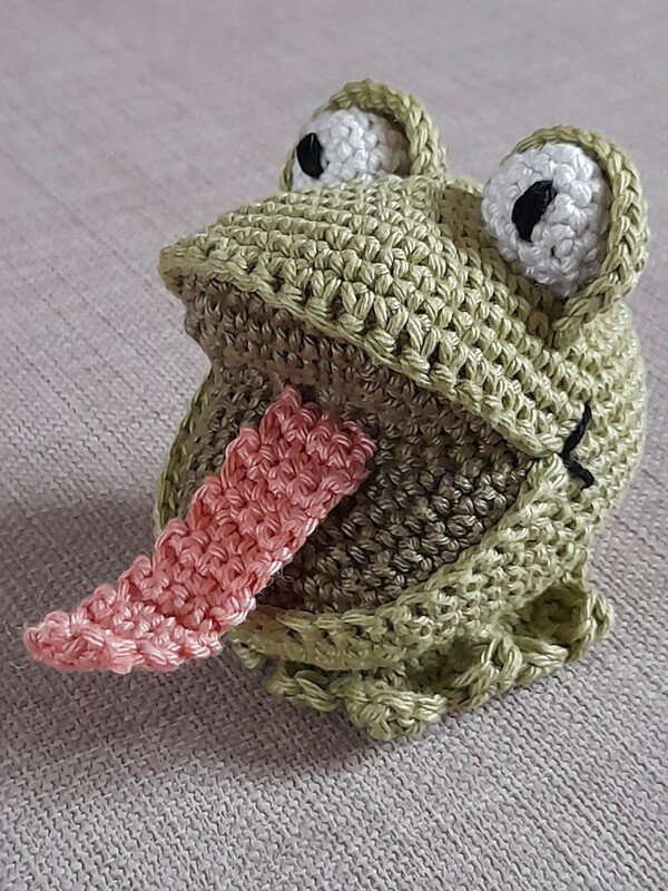 „Kalle“ wird mit angegebenem Garn und Nadelstärke ca. 8 cm hoch und 11 cm lang (mit Zunge).