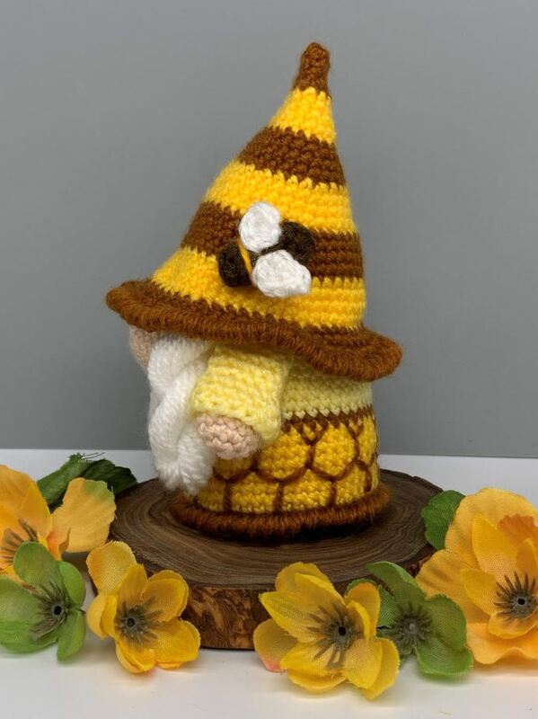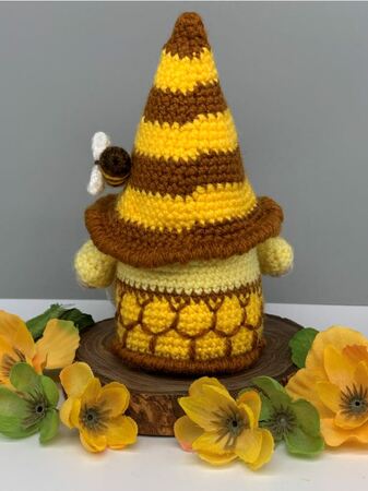 Mit dieser Anleitung kannst du einen entzückenden kleinen Bienen-Gnom häkeln, mit Wabenmuster am Körper und einer kleinen Biene am Hut.
