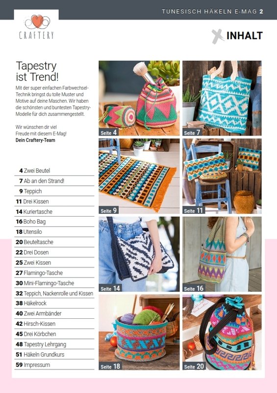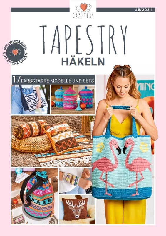 17 verschiedene Modelle und Sets mit Häkeltechnik Tapestry. Hier bei wir verschiedenartiges Garn bei der Häkelarbeit mitgeführt, so dass ein Farbwechsel ganz einfach ist und für bunte Muster gesorgt ist, die ins Auge fallen. Zusätzlich findest du in diesem E-Magazin einen ausführlichen Grundkurs zum Thema Häkeln so wie einen speziellen Lehrgang zum Tapestry häkeln, bei dem du Schritt-für-Schritt ganz leicht an diese neue Handarbeitstechnik herangeführt wirst.