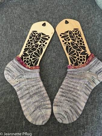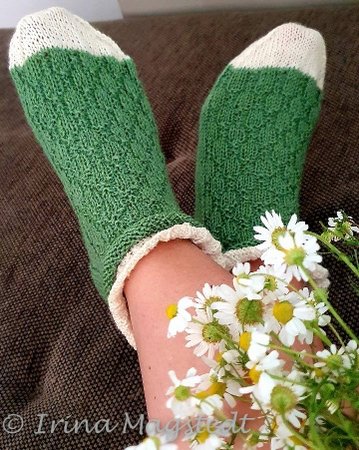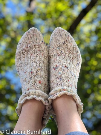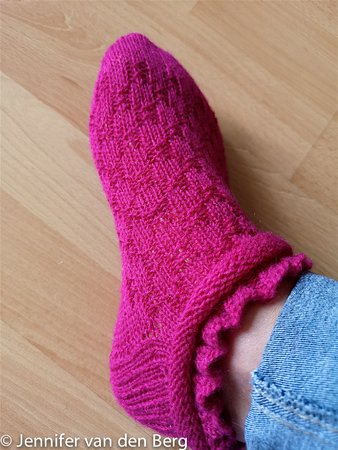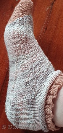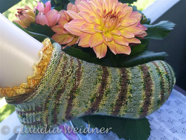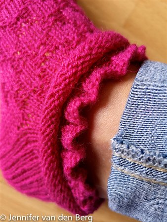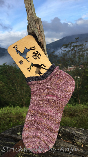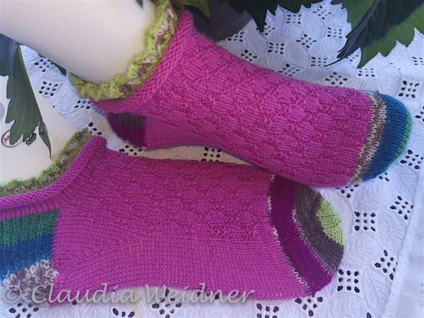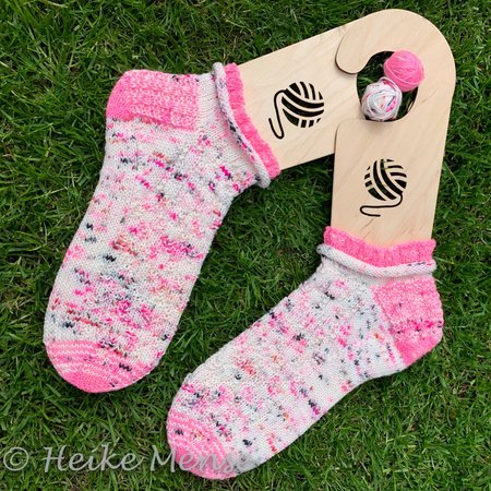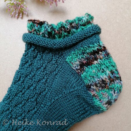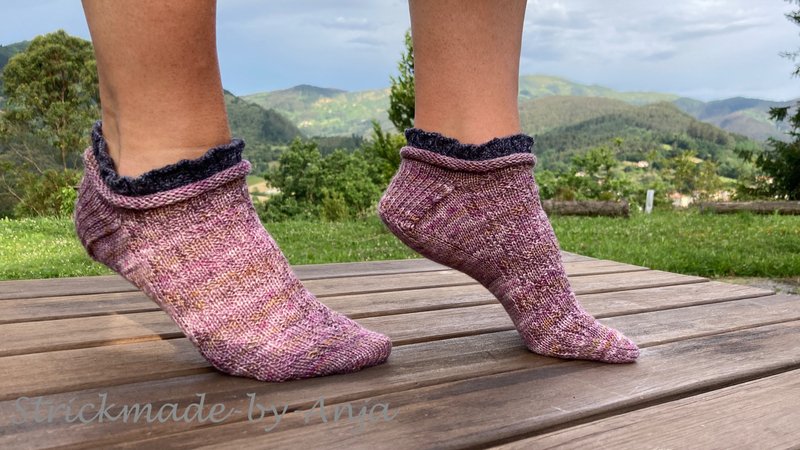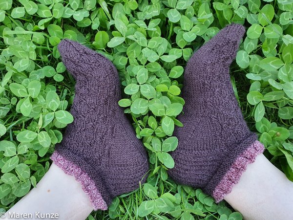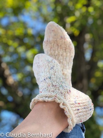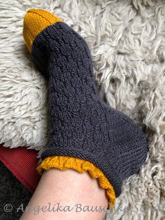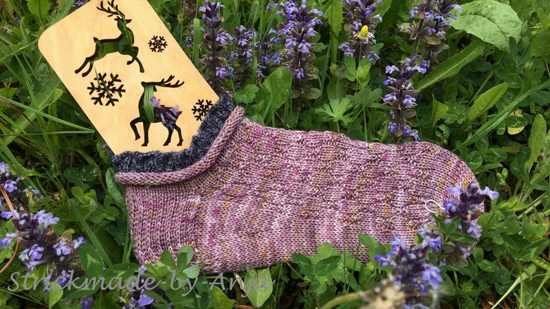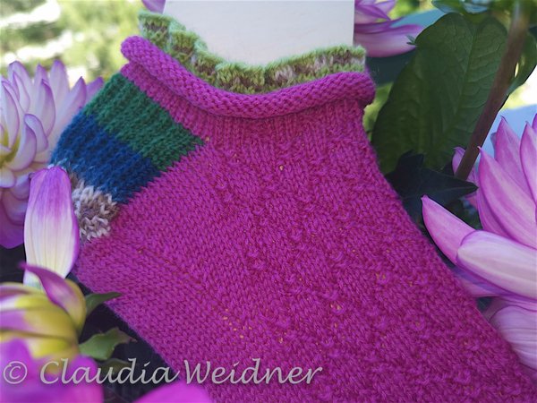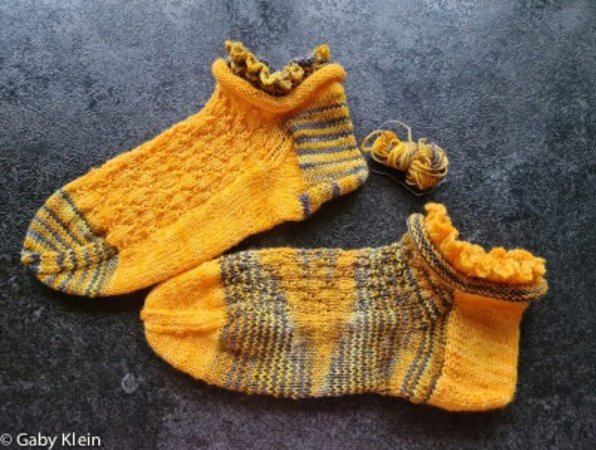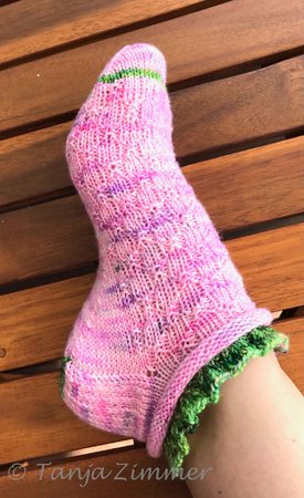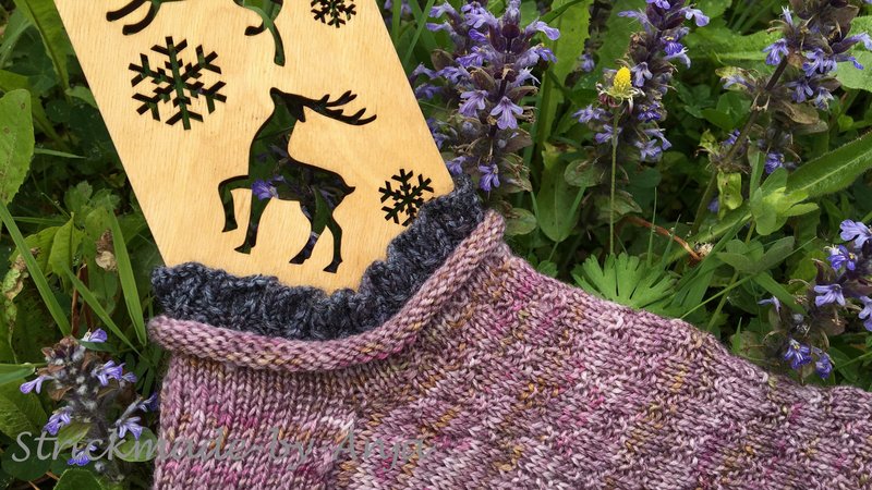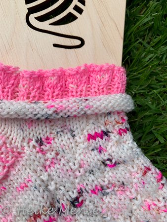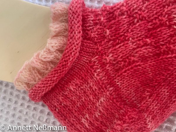In dieser Anleitung ist das gezeigte Rüschenbündchen mit dem Rollrand, sowie die Hufeisenferse und die Bandspitze beschrieben. Es kann aber beliebig ausgetauscht werden.