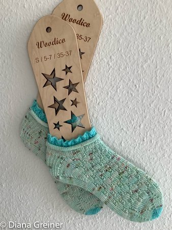 Du benötigst 4-fädiges Sockengarn mit einer Lauflänge von 400/420m pro 100g Deiner Wahl und eventuell einen Rest Sockenwolle ( ca 10g) als Kontrastfarbe für das Rüschenbündchen.