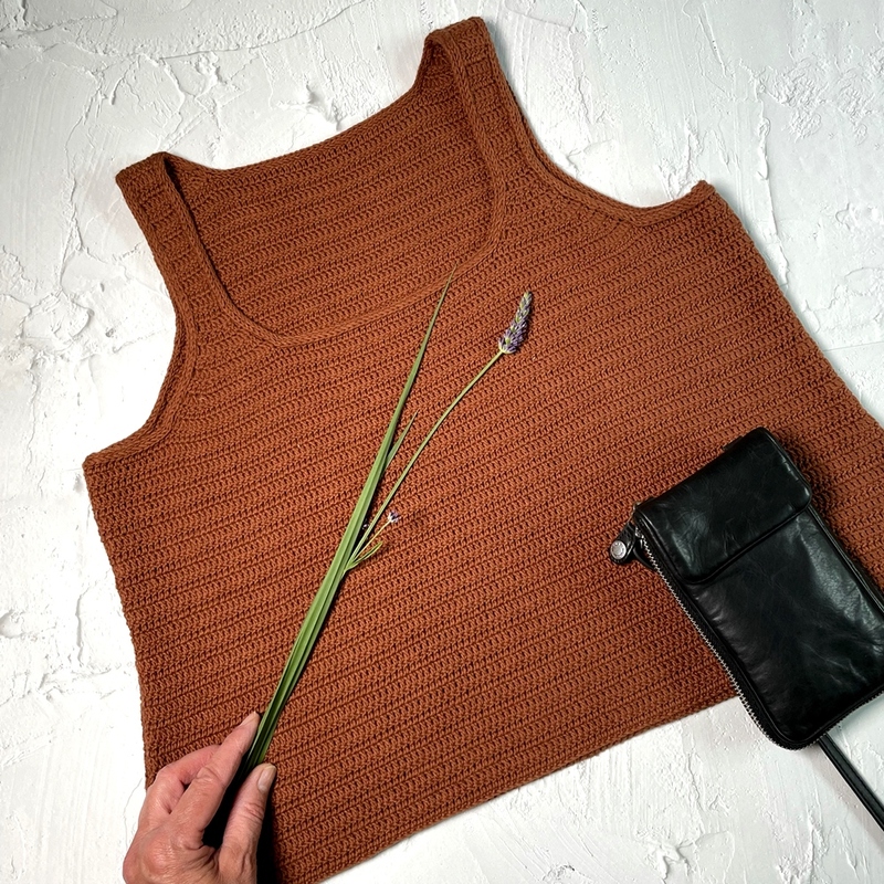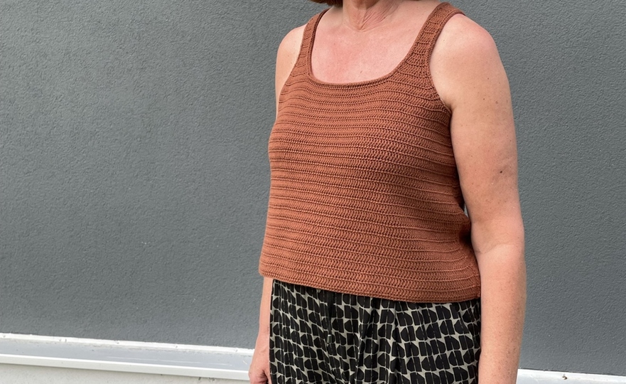 Top Lia ist kurz geschnitten und endet ungefähr am Hosenbund. Es kann gut zu Hosen und Röcken kombiniert werden. Das Top wird von unten nach oben gehäkelt und anschließend mit I-Cord Rändern umstrickt.