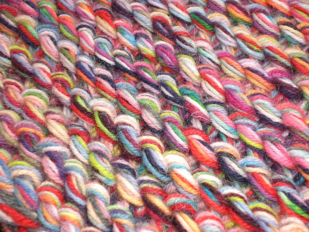 Kunterbunte Sockenwollreste ca 170g für eine Decke von 30x30cm.