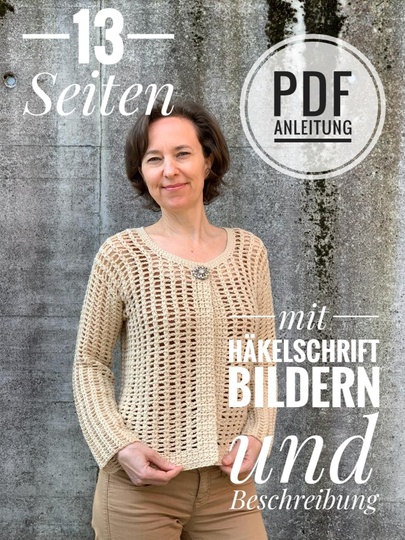 PDF Häkelanleitung auf insgesamt 13 Seiten für Größen 34-54.