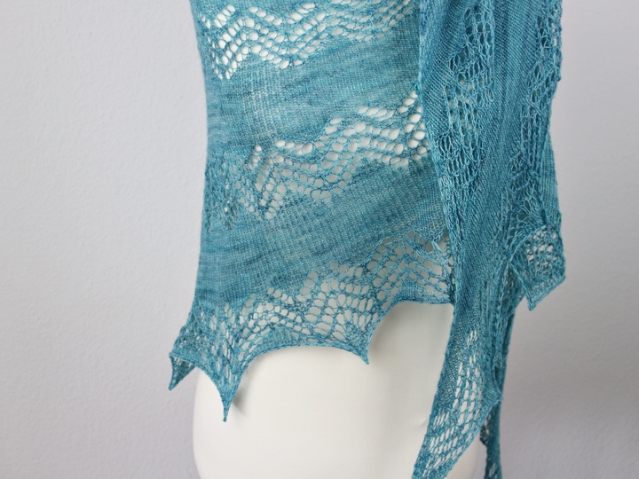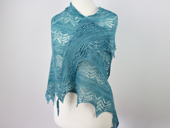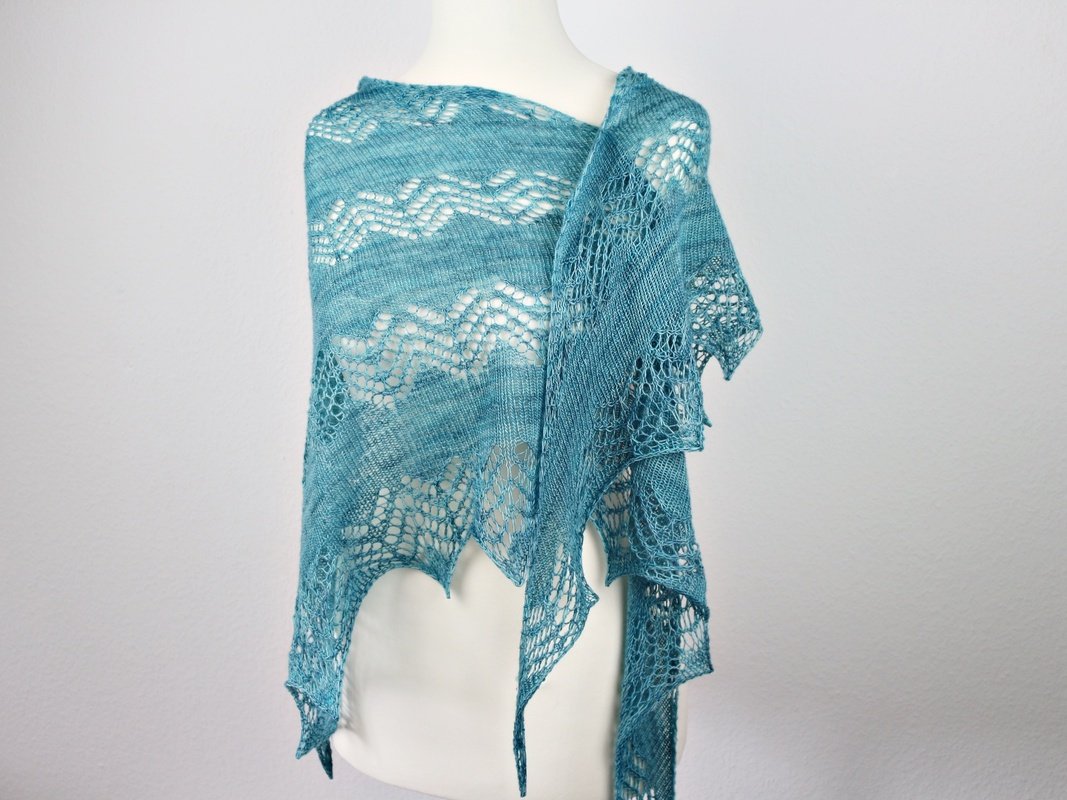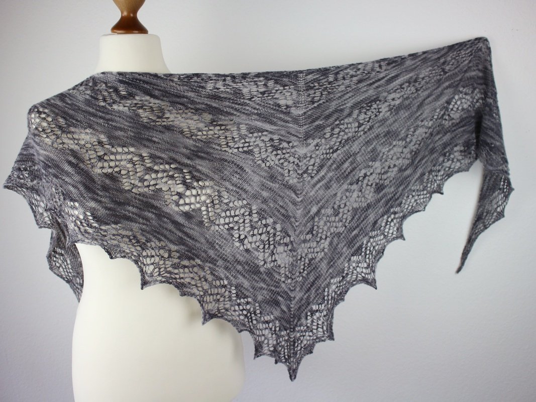 Garn: Madelinetosh Prairie 100% Wolle, LL 768 Meter auf 100 Gramm, gezeigt in der Farbe „Translation“, Verbrauch ca. 95 Gramm. Wenn mehr Garn vorhanden ist, dann kann das Tuch durch das Wiederholen der Teile 1 und 2 ganz einfach vergrößert werden.