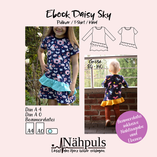 Der Verkauf genähter Kleidungsstücke nach dem Ebook Daisy Sky ist in einer Kleinserie von bis zu 20 Exemplaren gestattet.Weitergabe, Tausch oder Vervielfältigung von Schnittmuster oder Tutorial ist verboten. Alle Rechte liegen bei Nähpuls.