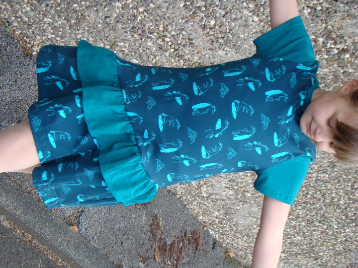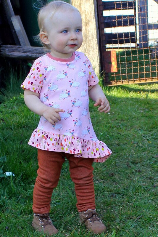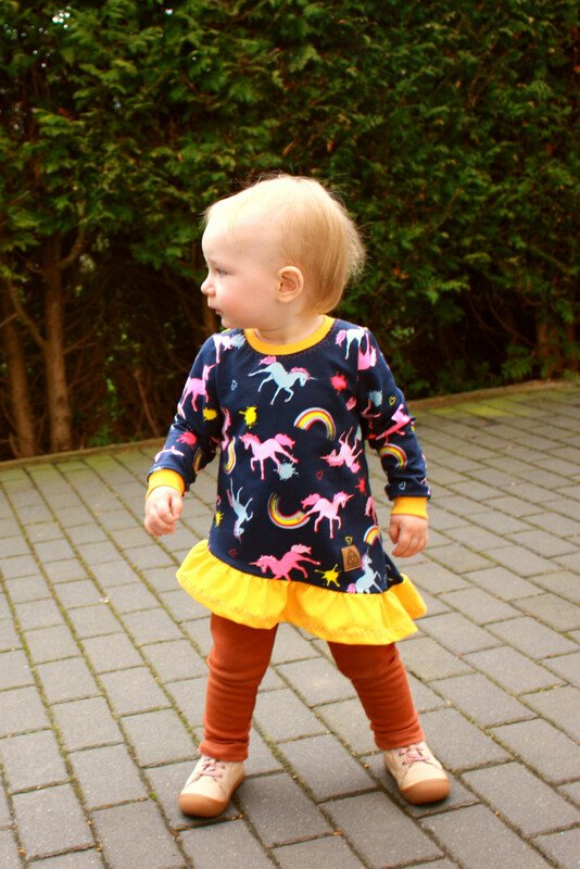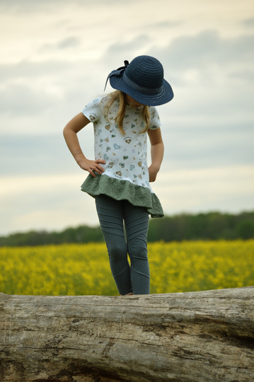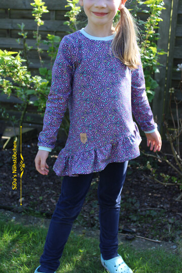 Das Ebook Daisy Sky ist ein Ganzjahresschnitt und enthält kurze, wie lange Ärmel und einen schrägen Volant. Mit dem Annähen des zweiten Volants entsteht ein Kleid. Je nach Stoffwahl mit Jersey oder Sommersweat entsteht z.B. ein Langarmpullover, ein T-Shirt oder ein kurz- oder langärmeliges Kleid für den Sommer oder für kältere Jahreszeiten.