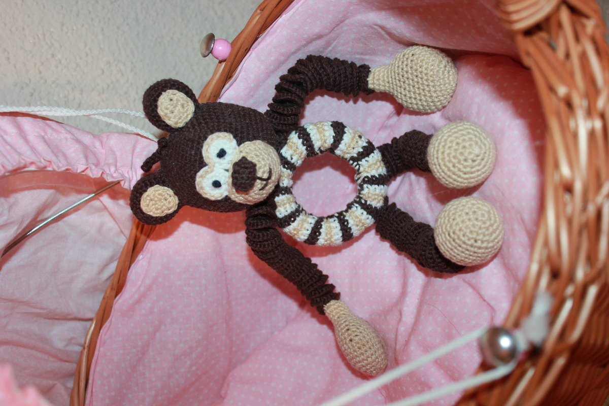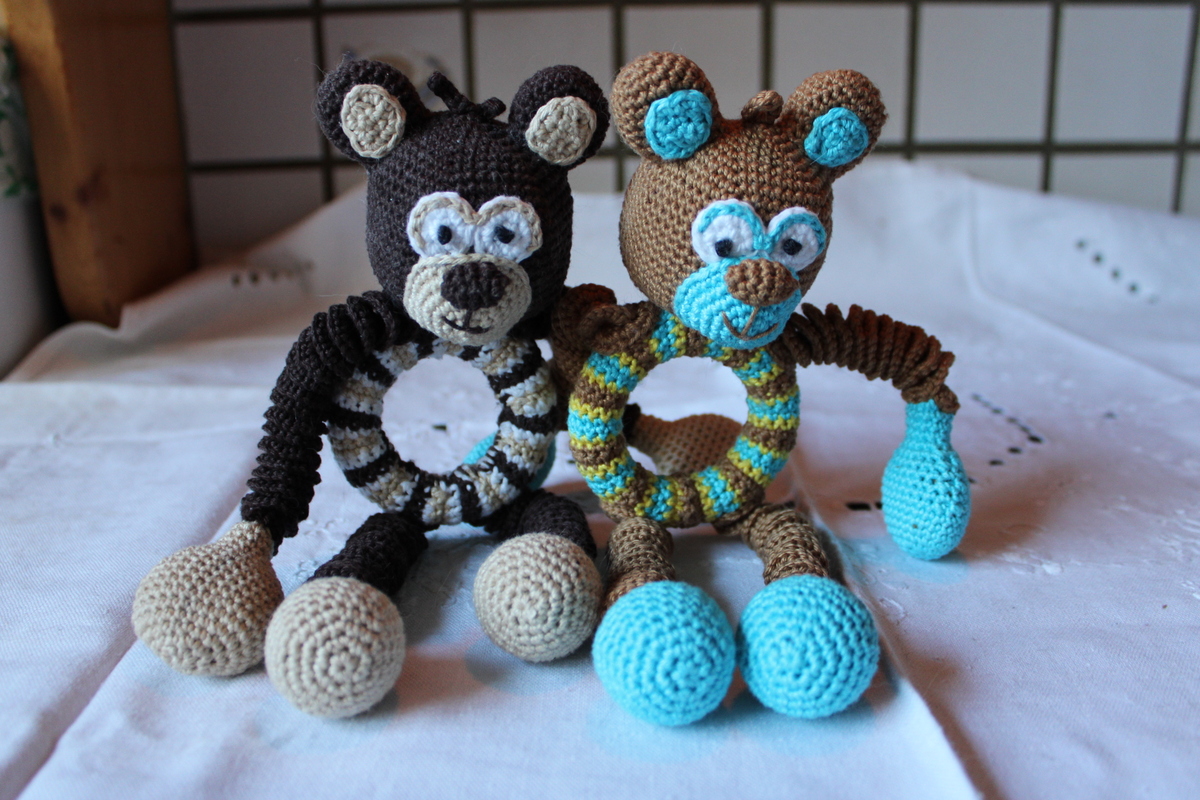 Biobaumwoll Garn, Rasseldosen, Rasselkugeln, Quicker, Holzring, Häkelnadel, Füllmaterial, Schere, Stopfnadel,
