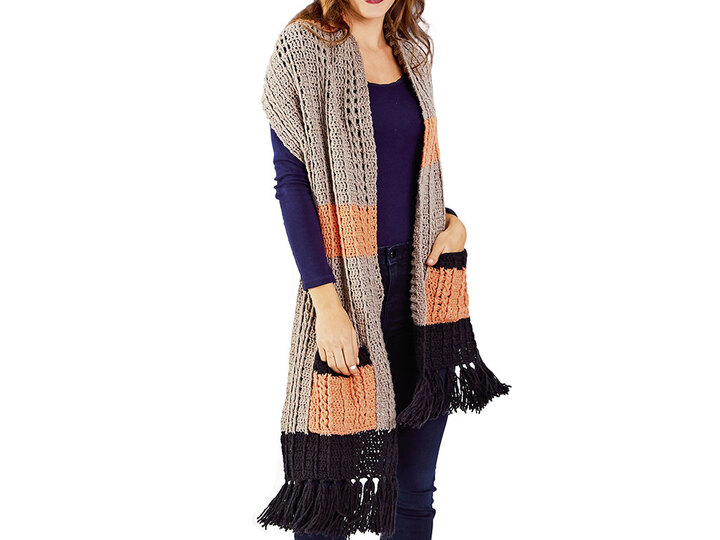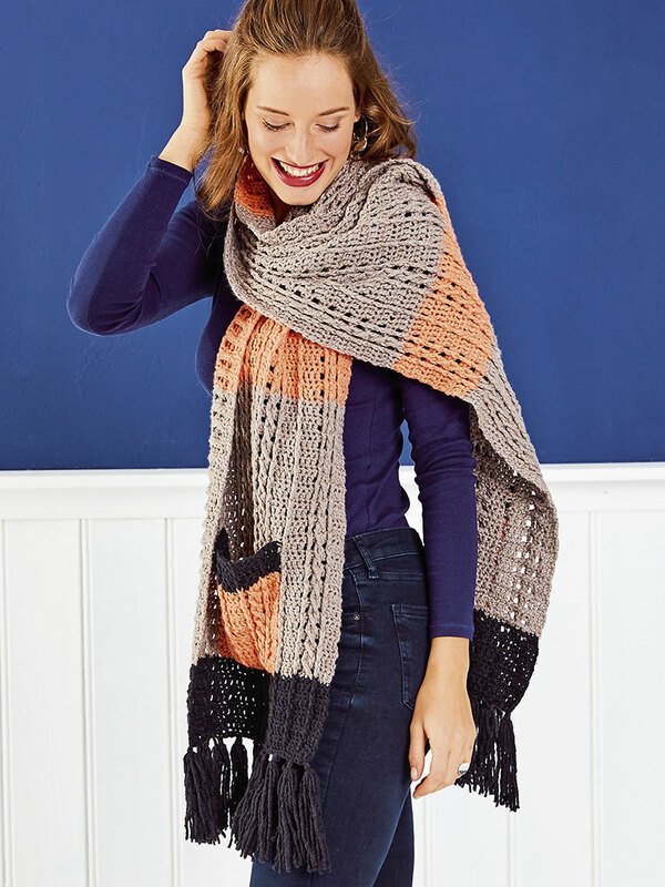 Dieser Riesenschal ist perfekt geeignet zum Reinkuscheln und das edle Garn macht das zu einem besonderen Vergnügen. Das praktische sind auch die beiden Taschen, ersetzten sie doch ab und zu die Handschuhe.