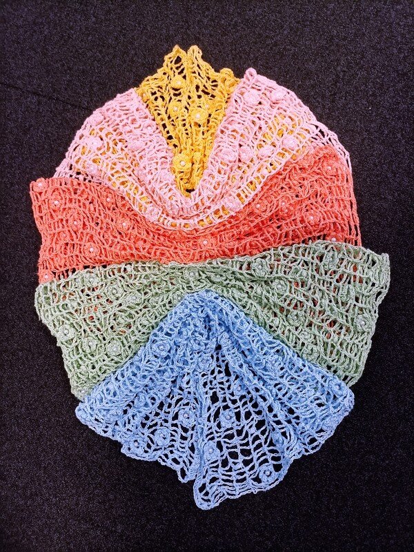 Daher sind Garn, Materialverbrauch, Größe der Häkelnadel und Größe der Beispieltücher am Ende der Anleitung jeweils bei den Fotos der Testerinnen angegeben.