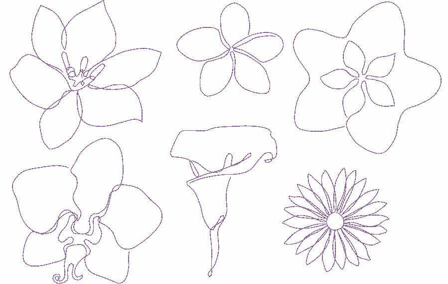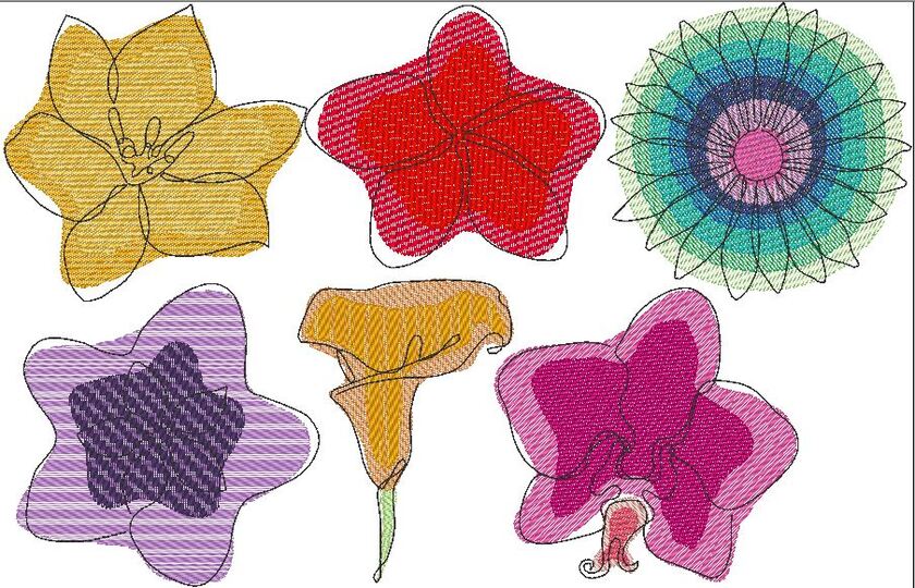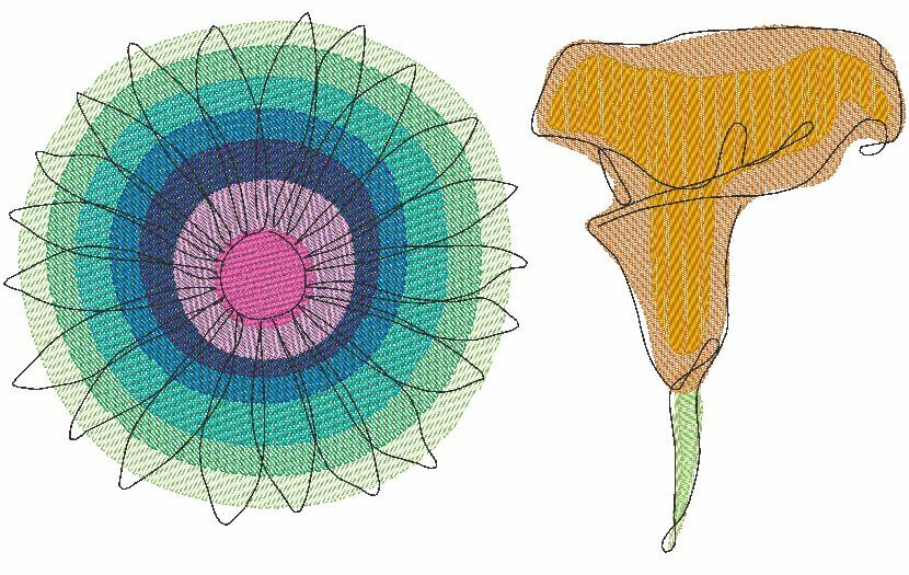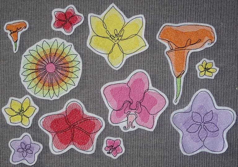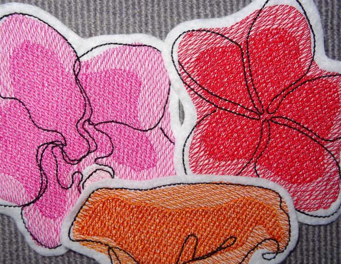 und die Blumen farbig unterlegt, die farbige Stickerei wird nicht dicht gestickt, sodass der Untergrund noch etwas zu sehen ist.