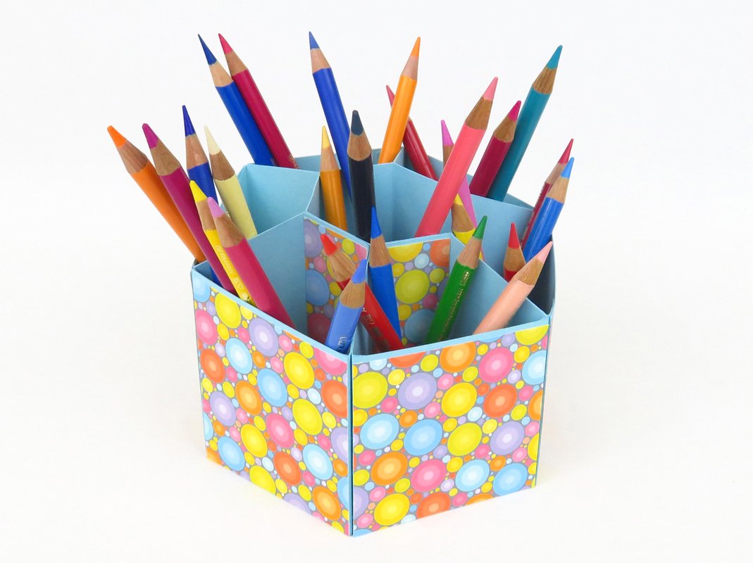 Zum Basteln dieses Stiftehalters sollst du mit Schere, Cutter und Schneidelineal umgehen können, wissen, wie man Faltlinien einprägt und Grundformen faltet. Auch sollst du bereits mit Klebstoff gearbeitet haben. Unter diesen Voraussetzungen wirst du diesen Halter leicht nacharbeiten können.