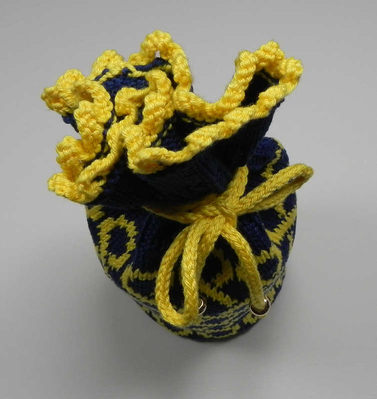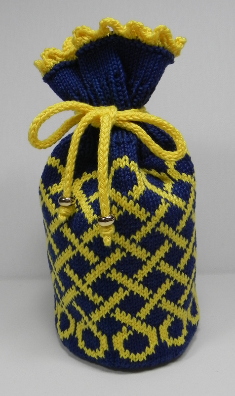 Dies ist eine Strickanleitung zur Herstellung eines Geschenkbeutels mit einem keltischen Muster. Bestehend aus der Farbe Blau und Gelb. Für die Kordel zum Zuziehen des Geschenkbeutels werden auch 2 Perlen als Deko benutzt.