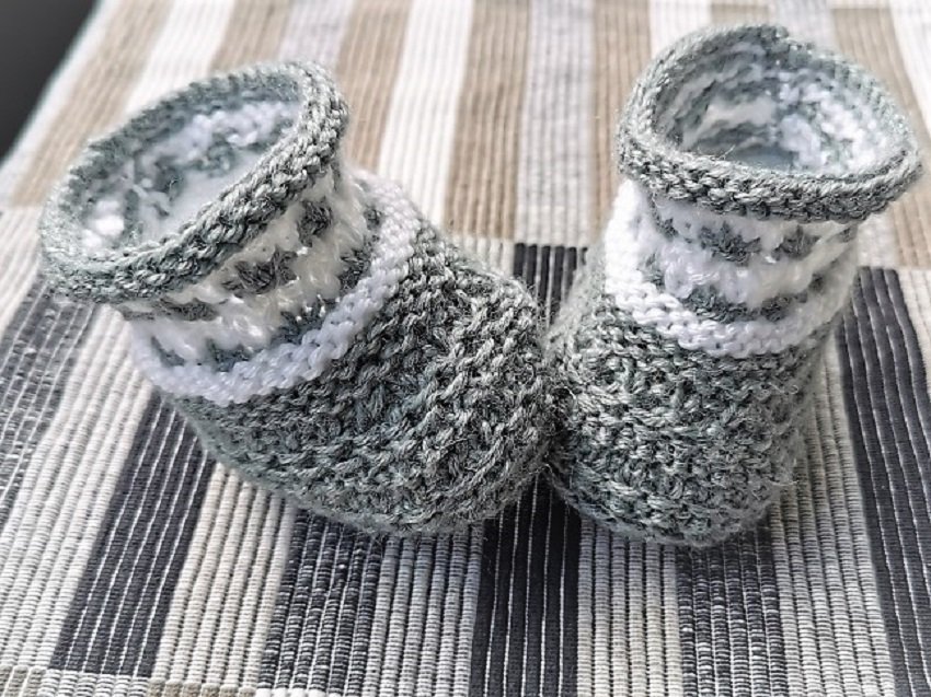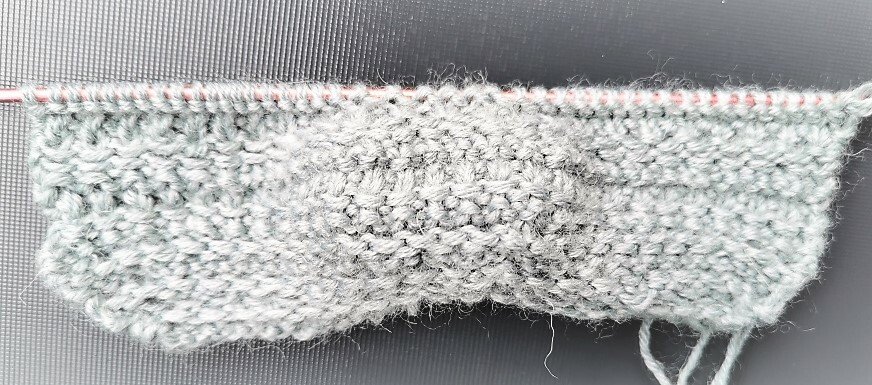 Die Sohle wird am Stück über 2 Nadeln gestrickt und das Bündchen mit dem Nadelspiel in Runden.