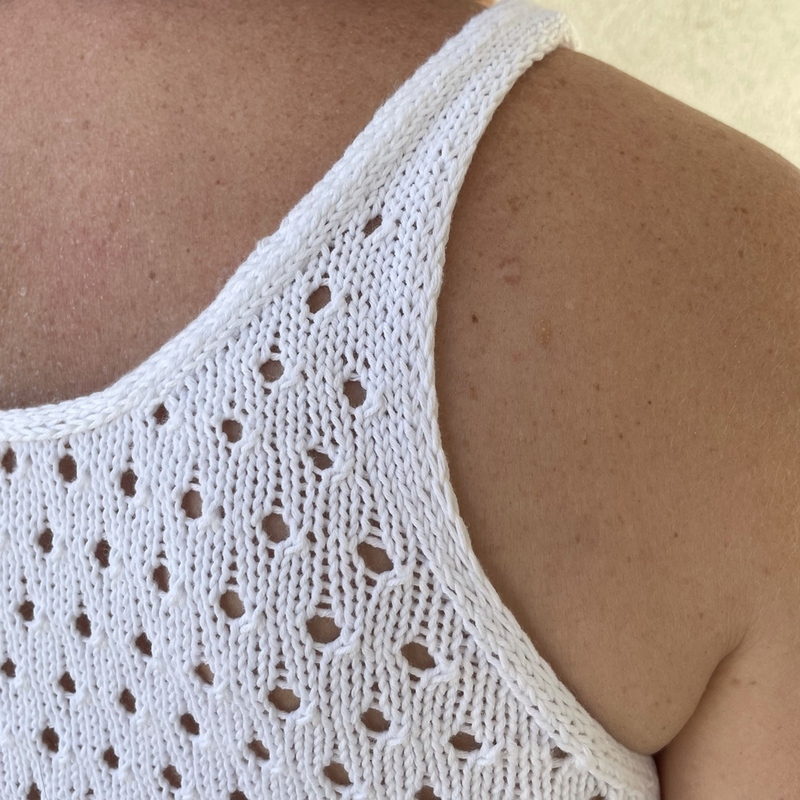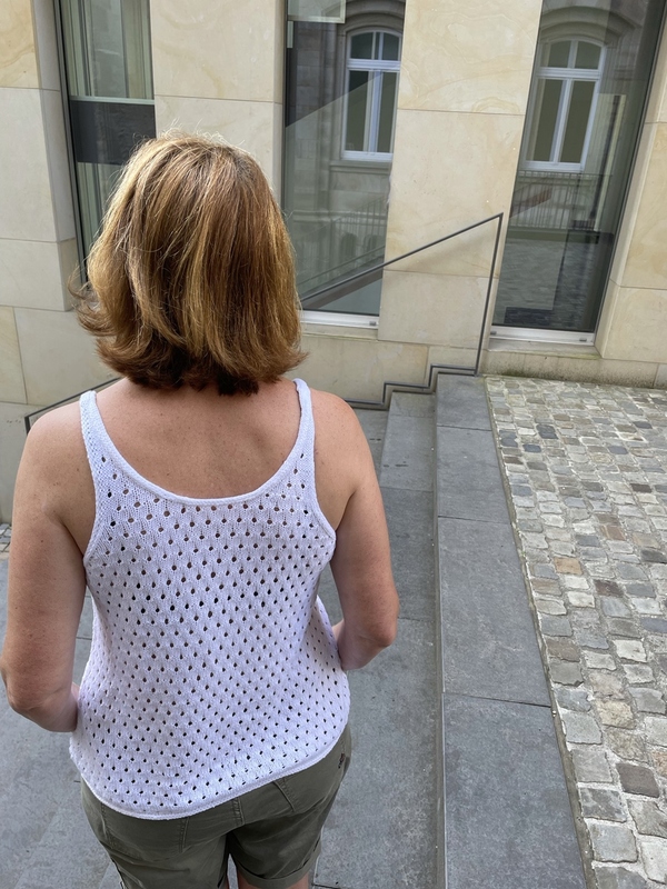 Das Top Daria ist ein luftig leichtes Sommertop und wird einfädig von unten nach oben gestrickt. Die Länge kann bei Bedarf individuell angepasst werden. Das Vorderteil und das Rückenteil werden in Reihen gestrickt. Abschließend wird der Halsausschnitt und der untere Rand mit einem I-Cord Rand umstrickt.