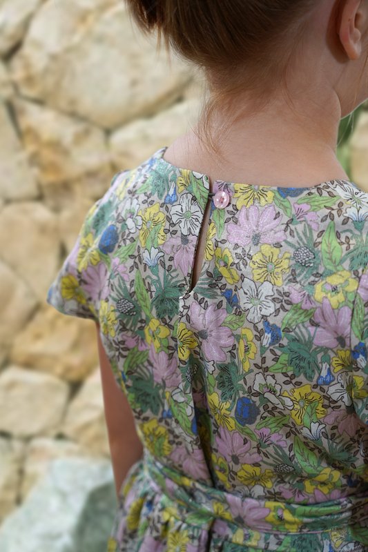 Aria ist ein luftiges Sommerkleid, das mit verschiedenen Ausschnittvarianten genäht werden kann, darunter ein rückwärtiger Tropfenausschnitt , der mit einem Knopf geschlossen wird. Durch ein Gummiband an der Teilungsnaht und einen