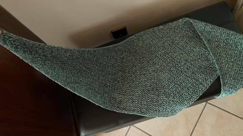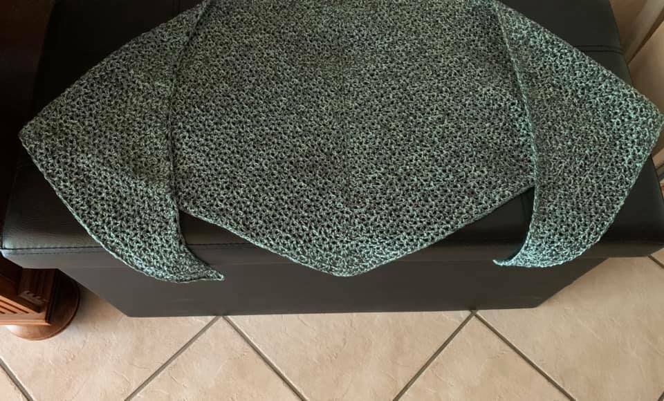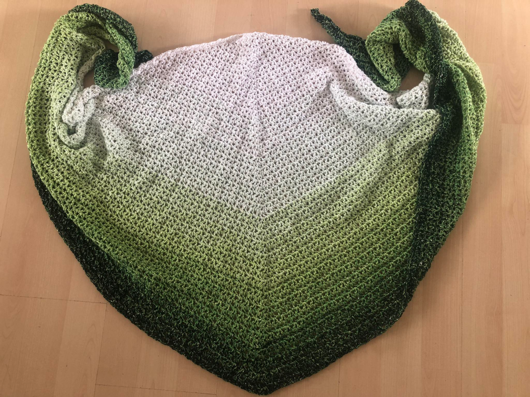 Mein Tuch ist locker gehäkelt, mit einem Verbrauch von 500m mit 3-Fäden bei NS 3,75 ca 183x44cm groß geworden.