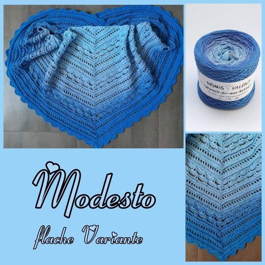 „Modesto“ heißt übersetzt „bescheiden“. Ich habe mich für diesen Namen entschieden, da das Tuch aus den sogenannten Standardmaschen, die im ständigen Wechsel angeordnet wurden, entstanden ist. Man kann sagen bescheiden, aber trotzdem ein echter Hingucker für Jedermann.