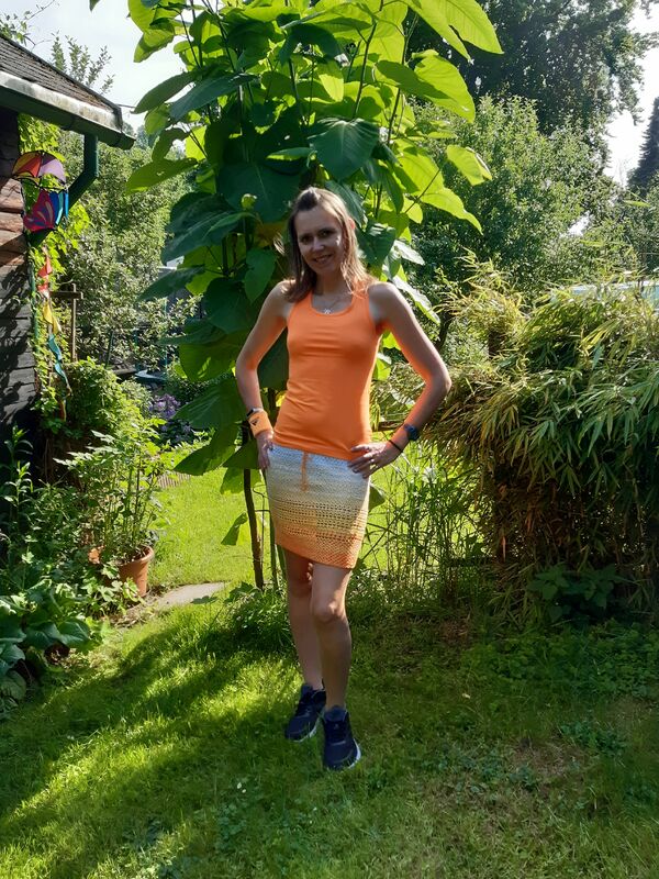 Für die Größe XS/S benötigst du einen Bobbel von ca. 550m bis 650m, je nachdem wie locker oder fest du häkelst und wie lang dein Rock werden soll