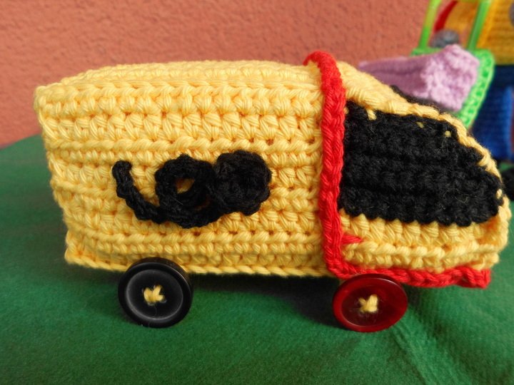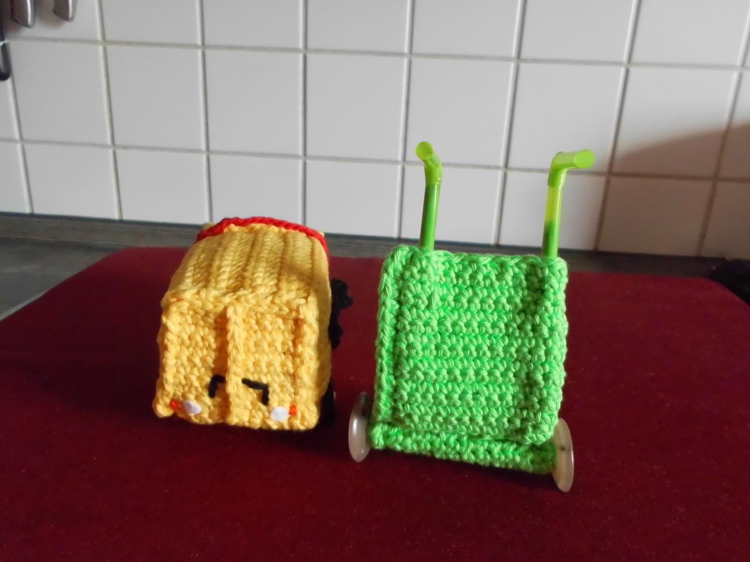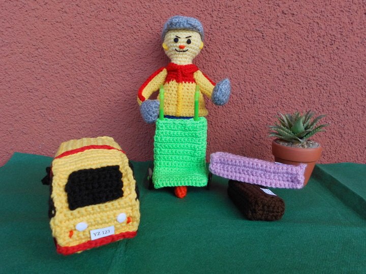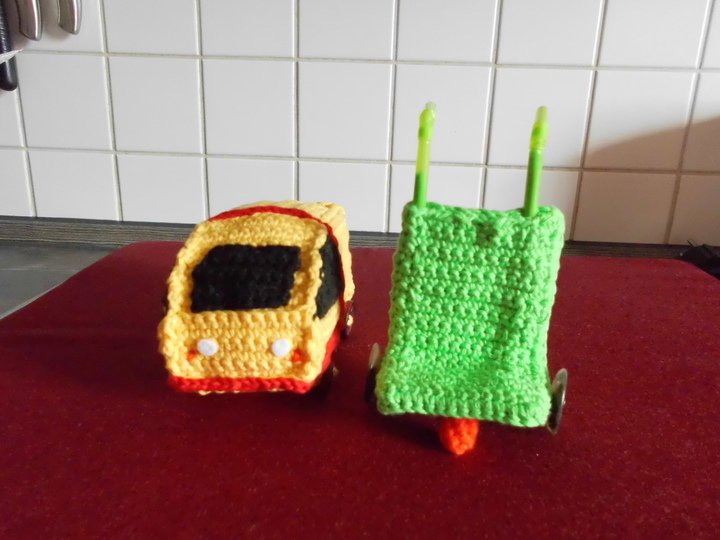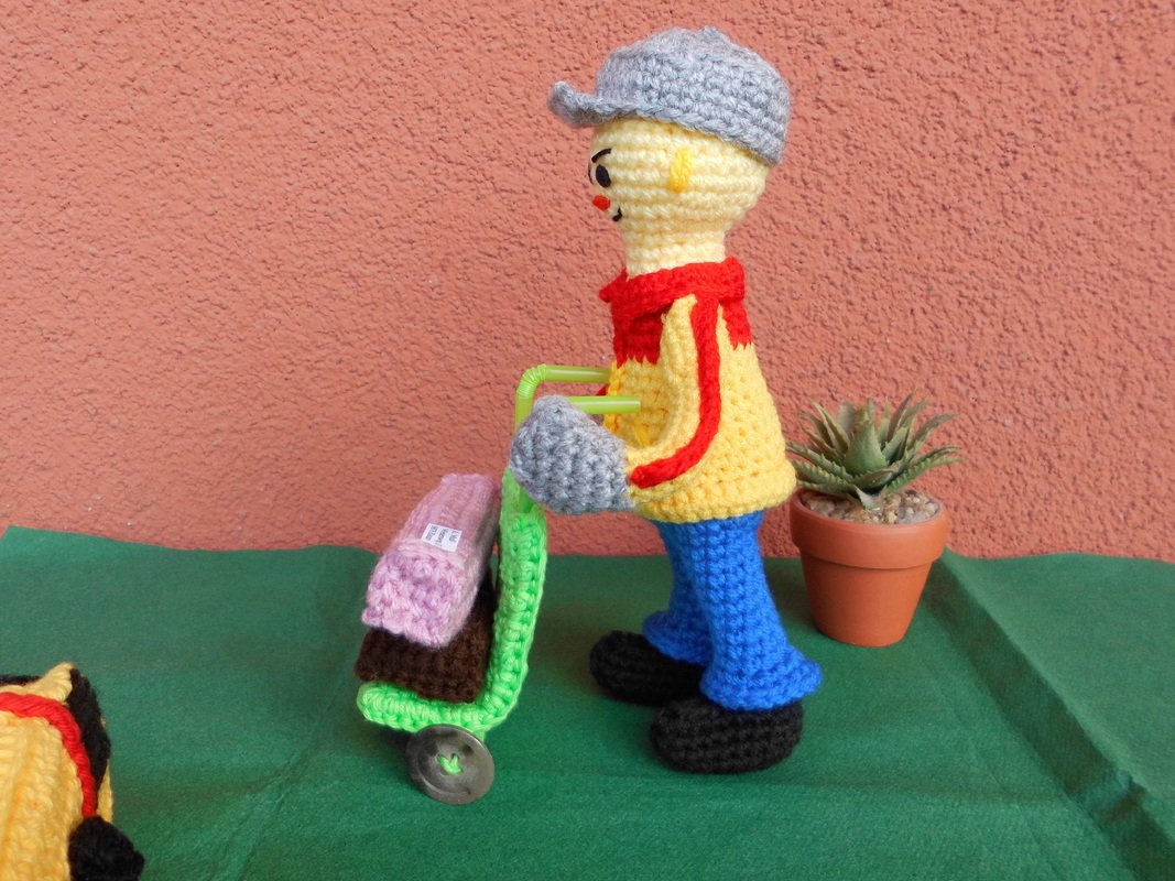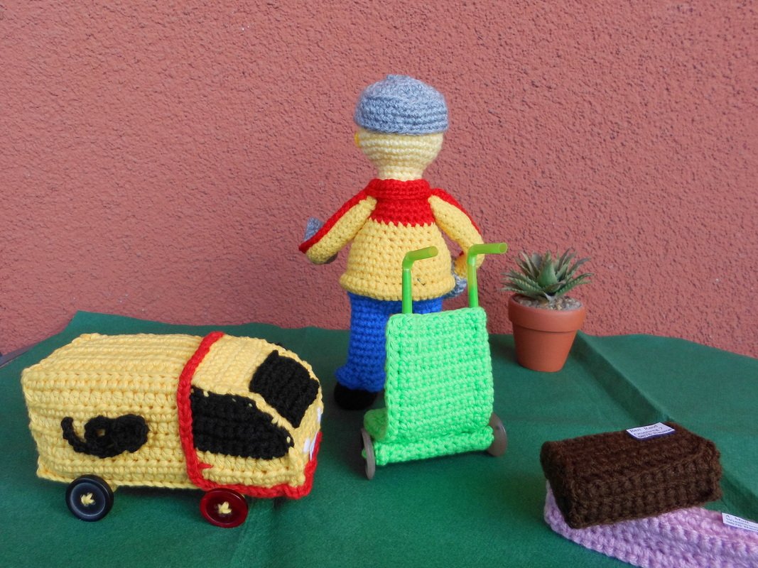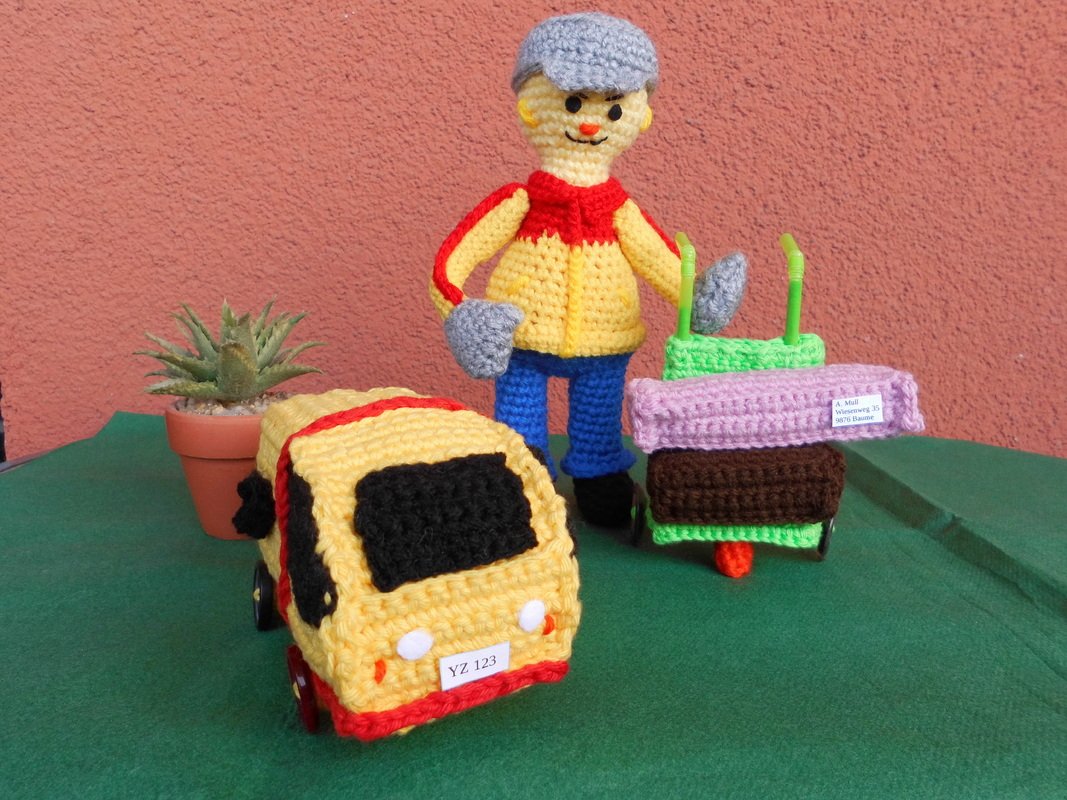 Eine Anleitung zum häkeln vom Paketmann, seinem Auto und der Transportkarre mit Paket.