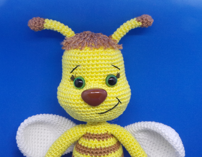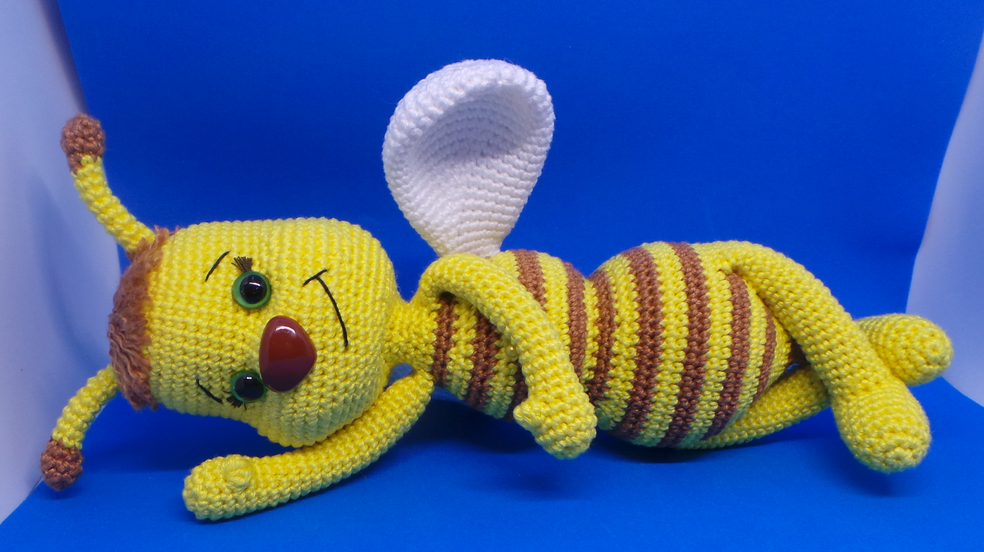 Mit einem Baumwollgarn 50g/125m und Häkelnadel 2,5mm gehäkelt wird sie etwa 24cm groß (ohne Fühler).Du kannst das Bienchen mit jedem anderen Garn/Wolle häkeln, mit entsprechender Nadelstärke für das von dir verwendete Garn/Wolle. Je nach dem, wie dick oder dünn dein Garn/Wolle ist und wie fest oder locker du häkelst wird die Figur kleiner oder größer ausfallen.