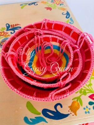 Der große Korb hat einen Durchmesser von 25 cm und eine Tiefe von ca. 13 cm, der mittlere Korb hat einen Durchmesser von 20 cm und eine Tiefe von ca. 10 cm, der kleine Korb hat einen Durchmesser von 15 cm und eine Tiefe von ca. 8 cm.