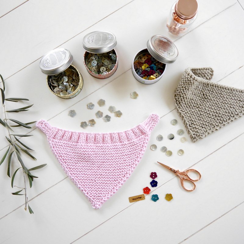 TINY-Tuch wird nahtlos von oben nach unten in Reihen gestrickt. Es wird am Bündchen oben gestartet und durch Abnahmen reduziert. Das Muster ist kraus rechts.