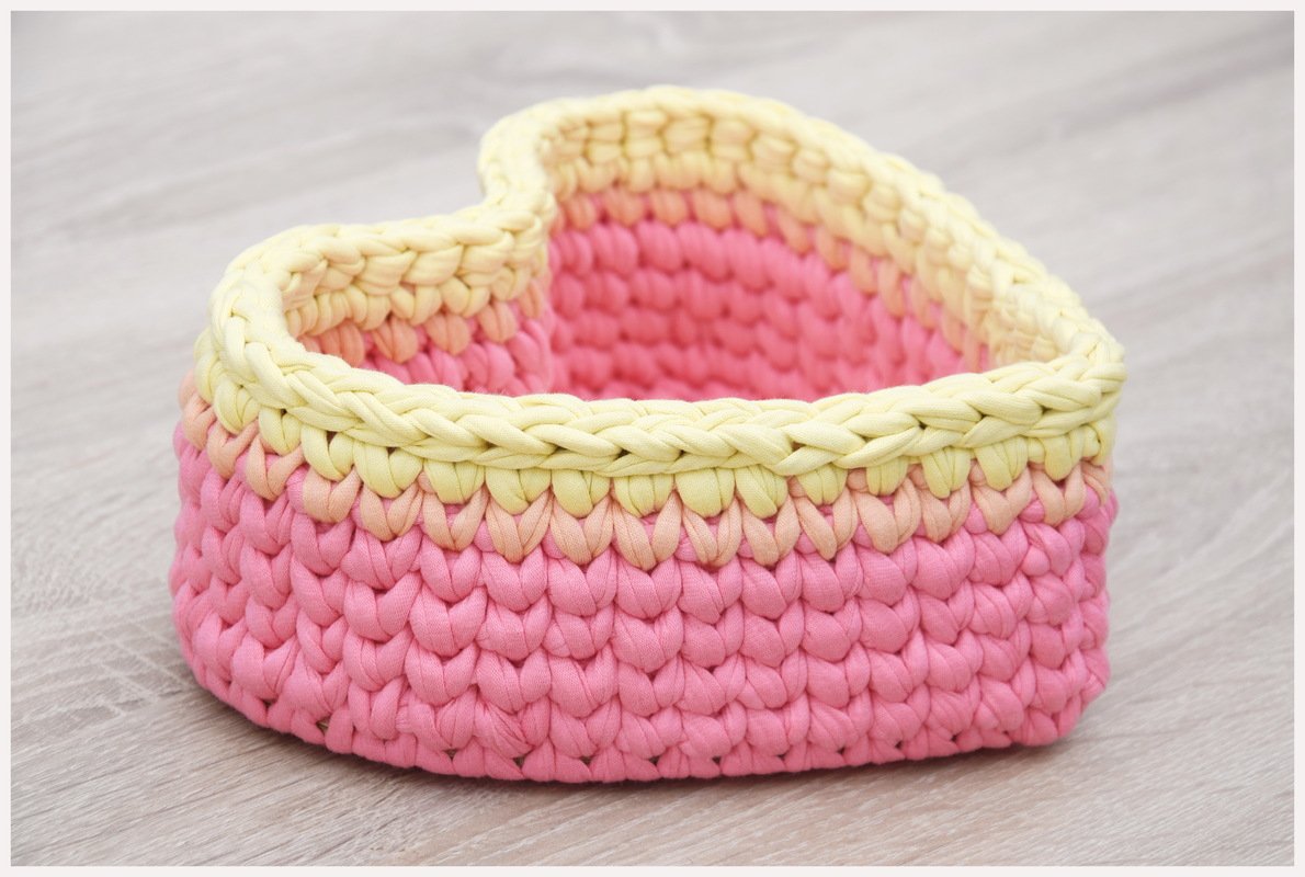 Das Körbchen wird mit einer Holzplatte in Herzform als Grundlage gearbeitet, so erhält es diese besondere Form. Als Muster erkläre ich hier den Strickstich, was dem Korb eine tolle Stabilität gibt. Das Muster ist einfach und kann auch gut von Anfängern mit Häkelkenntnissen umgesetzt werden. Die Farben kannst du für den Einsatz passend aussuchen und Lieblingsfarben oder passend zur Einrichtung aussuchen.