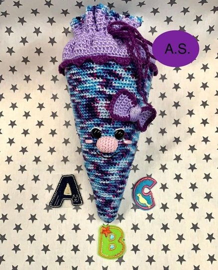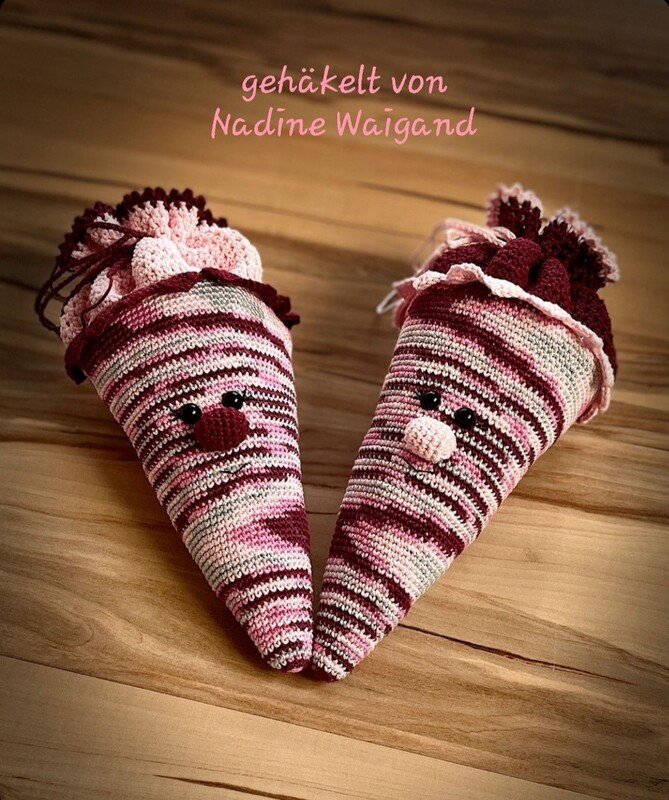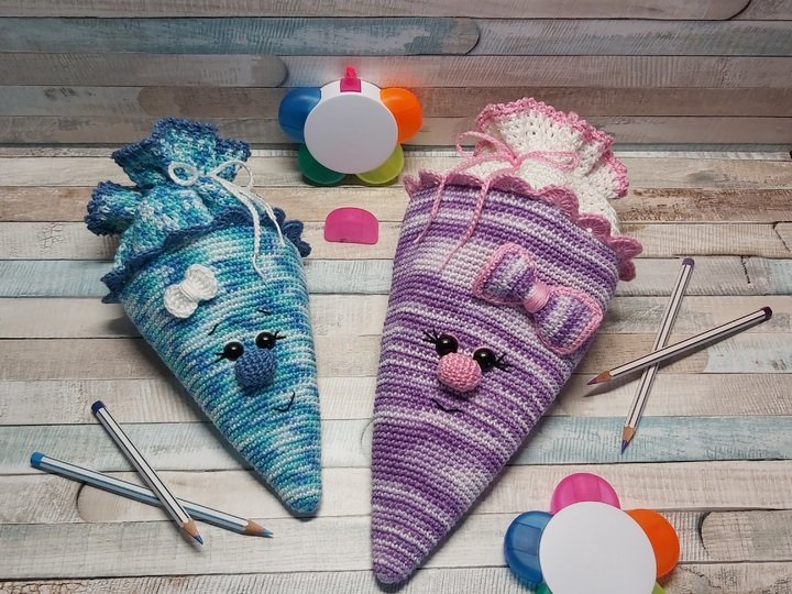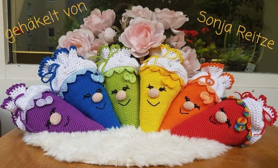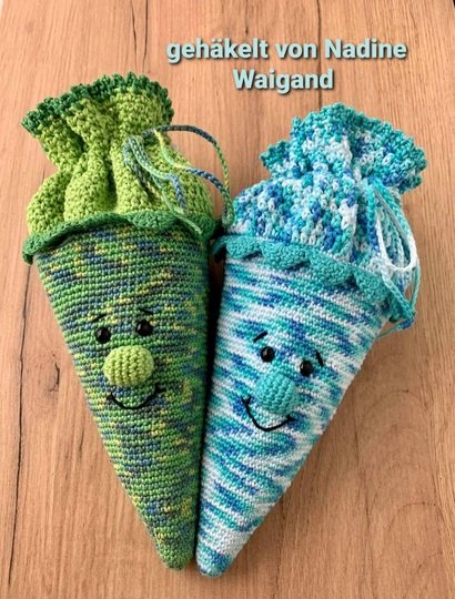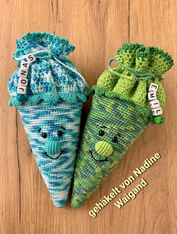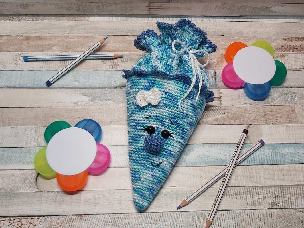 Die Schultüten wurden mit Baumwollgarn (50g-125m) und einer 2,5 Nadel gehäkelt.