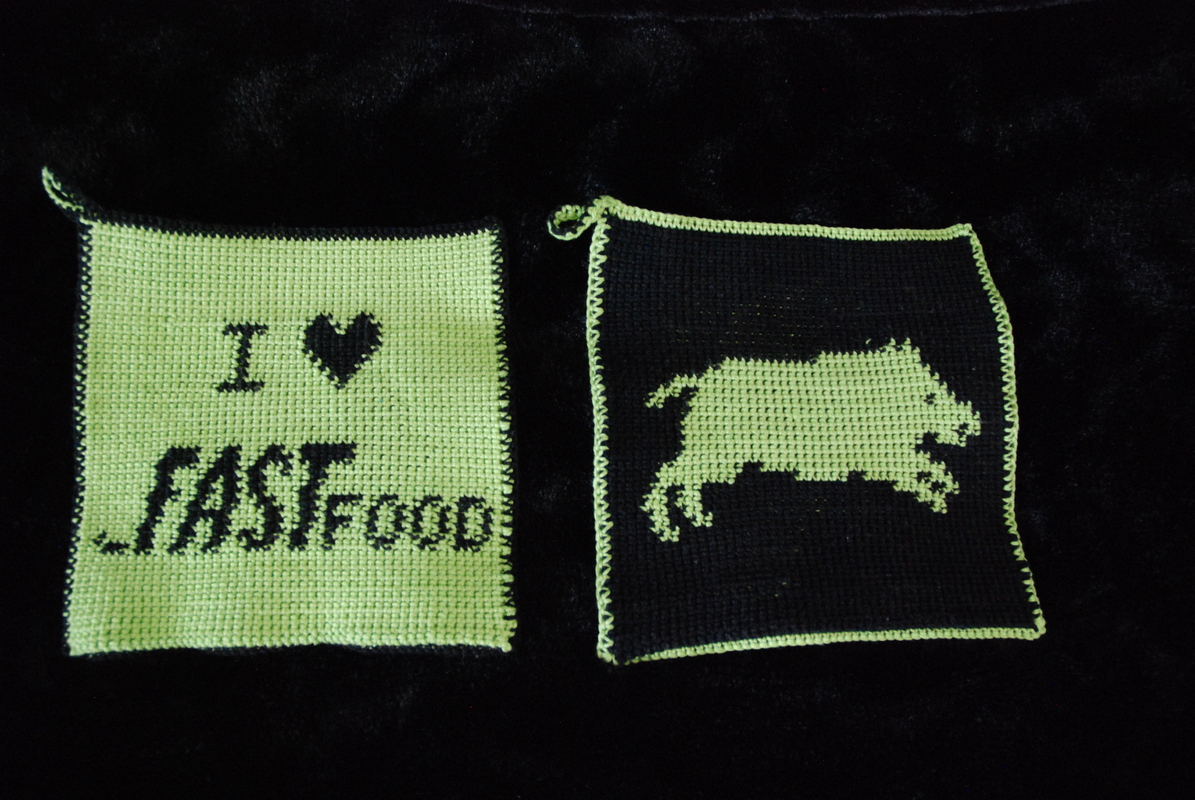 Sie essen gerne Wild? Oder Sie kennen jemanden der Jäger ist oder jagen selbst? Mit diesen in Doubleface-Technik gehäkelten Topflappen können Sie dieses Thema auf humorvolle Art in Ihre Küche holen. Die Anleitung enthält 4 verschiedene Motive (Text „I love Fastfood“, Silhouette von Wildschwein, Hirsch und Hase) sowie als Bonusmotiv den Text „Eat more Fastfood“.