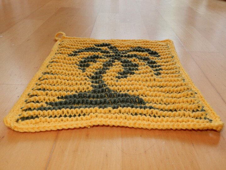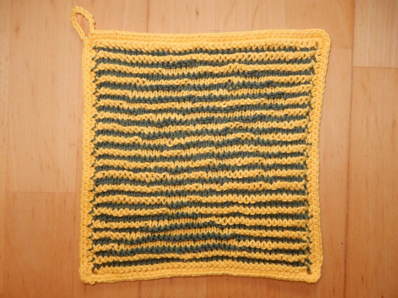 Man kann einen Topflappen daraus stricken. Dafür am besten Baumwollgarn verwenden und eine Schlaufe aus Luftmaschen zum Aufhängen anhäkeln.