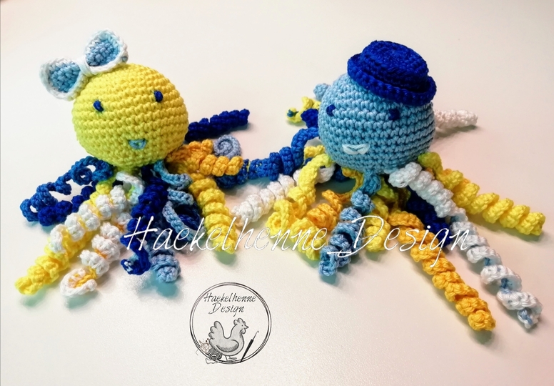 Mit dieser schönen Anleitung kannst Du die beiden Tintenfische nacharbeiten. Die Tentakeln, sowie der Hut und die Schleife sind in der Anleitung enthalten und machen richtig Spaß.