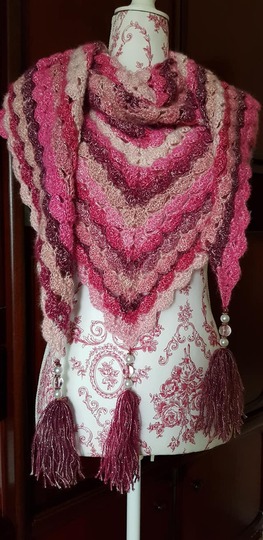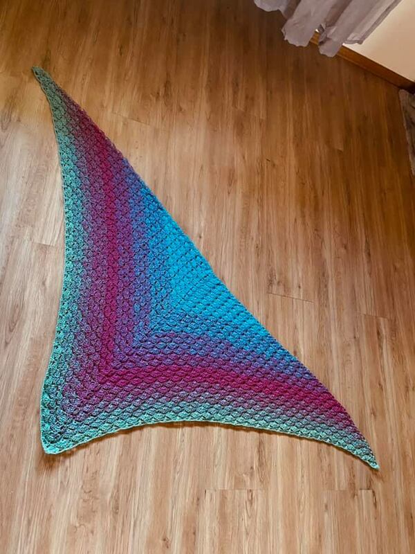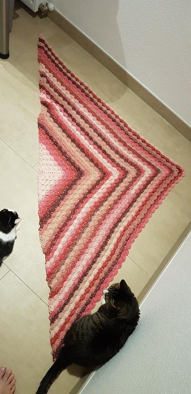 Da das Tuch nur aus zwei Musterreihen besteht, kann man die Größe frei variieren. Meine Tester haben Bobbel zwischen 800 m und 1500 m verwendet und Größen von 170x70 cm bis 305x100 cm erreicht!