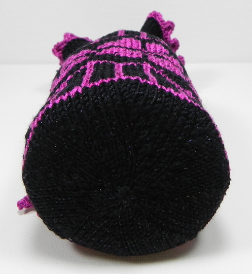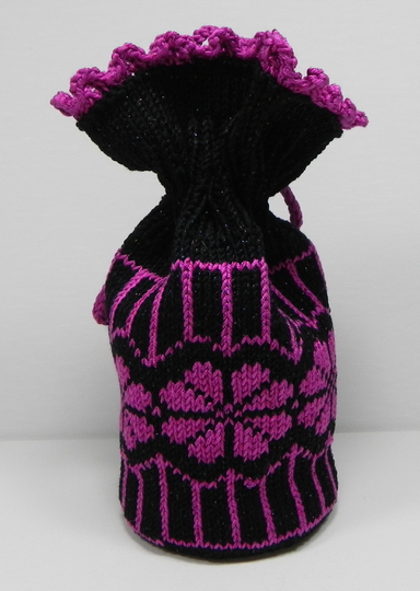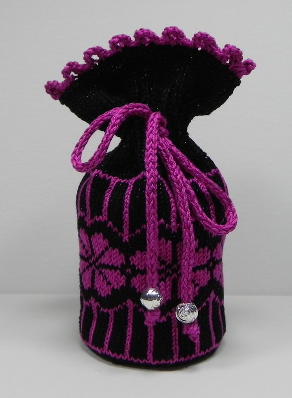 Dies ist eine Strickanleitung zur Herstellung eines Geschenkbeutels mit einem glitzernden Blumen-Muster, bestehend aus der glitzernden Farbe Schwarz und Pink. Für die Kordel zum Zuziehen des Geschenkbeutels werden auch 2 Perlen als Deko benutzt.