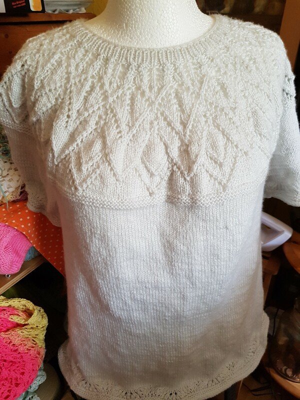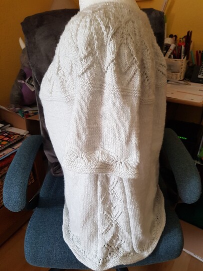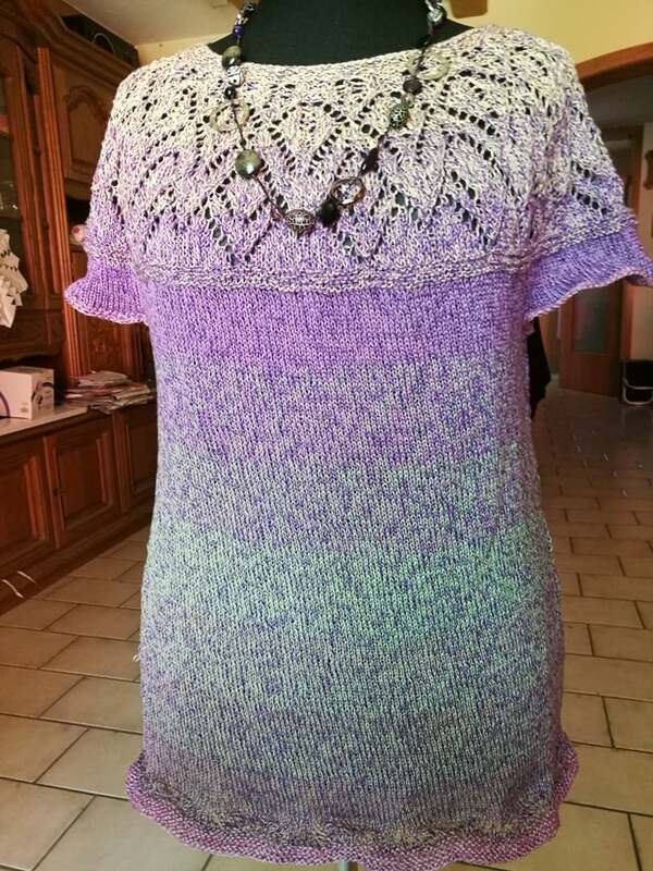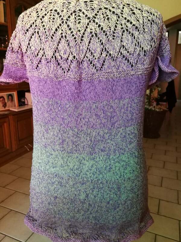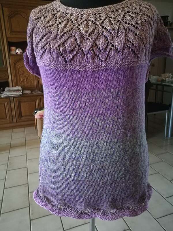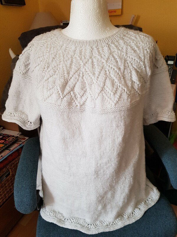Der Pulli bzw. das Shirt wird in Runden von oben nach unten gestrickt. Die erforderlichen Zunahmen ergeben sich durch das Muster.