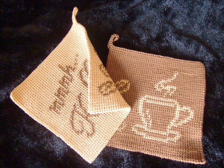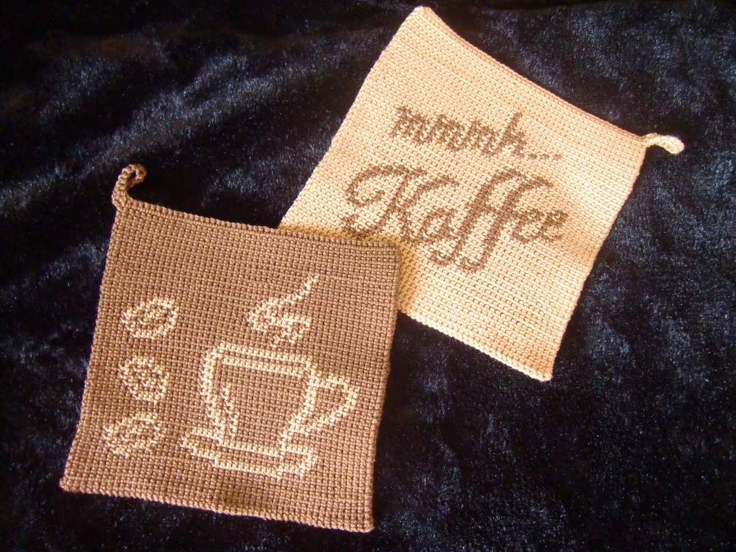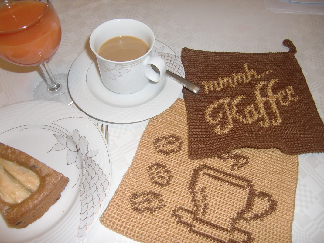 Ein Topflappenset für Kaffeeliebhaber. Die Motive dieser Topflappen sind ein Kaffeetassenmotiv und der Schriftzug „mmmh, Kaffee“. Diese können bei der Doubleface-Technik nach Belieben kombiniert werden.